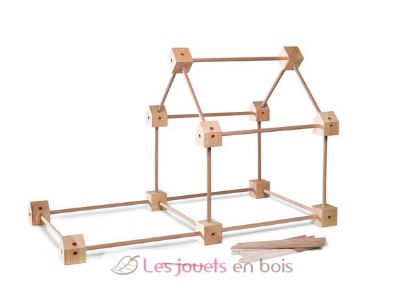 Le Trigonos Start comprend 42 pièces : 6 cubes de jonction, 6 triangles de jonction, 30 baguettes de deux longueurs différentes (26 et 40 cm). Il est livré dans un coffret en bois.