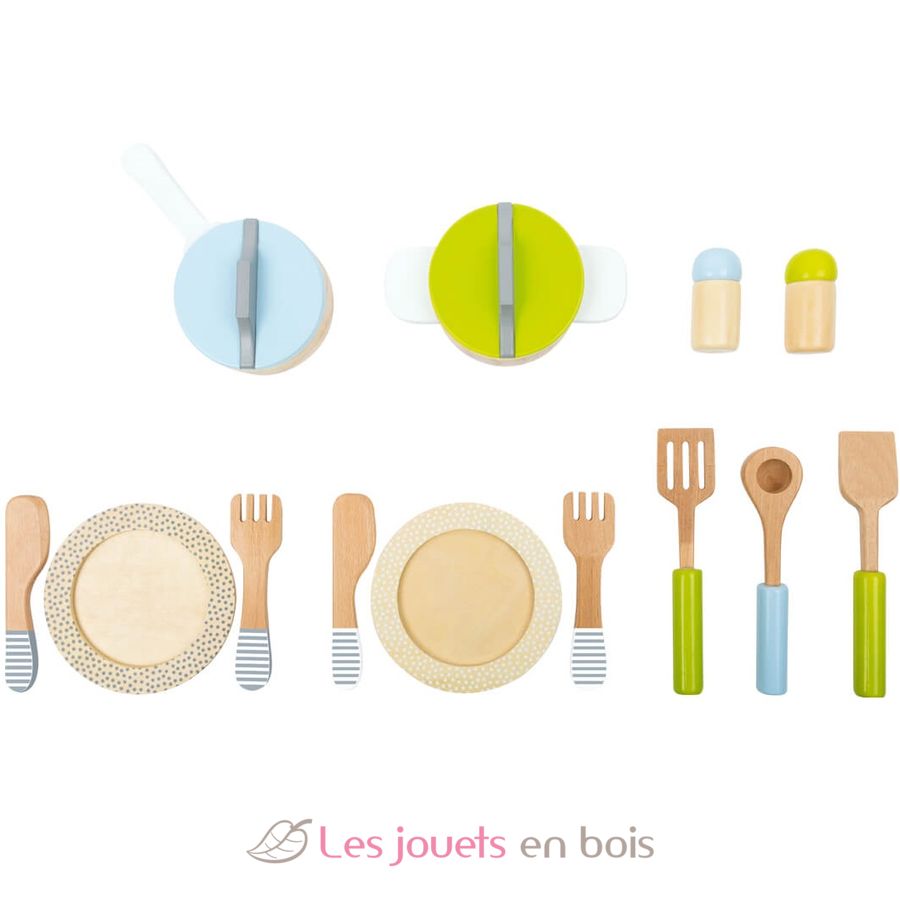 Avec ce joli set de dinette en bois, la cuisine d'enfant est parfaitement équipée et la table est dressée pour deux convives.