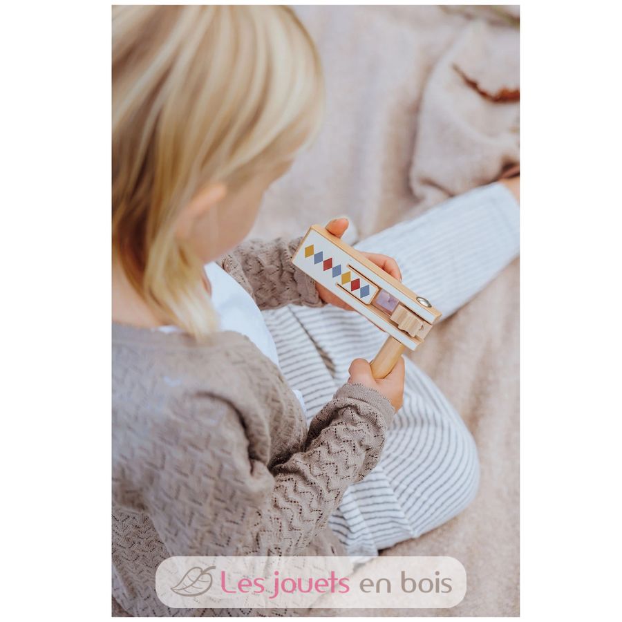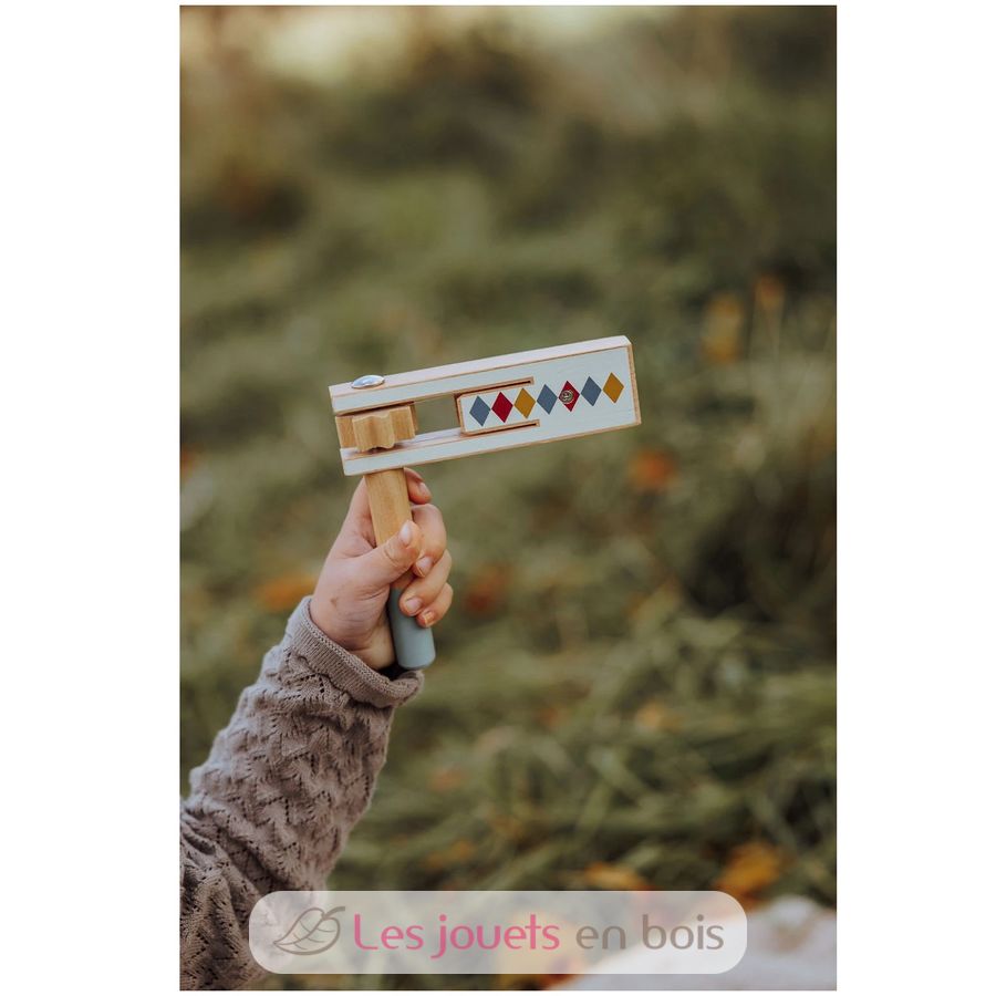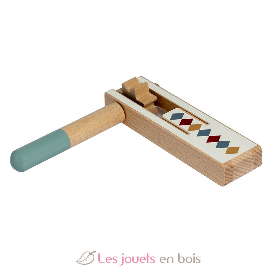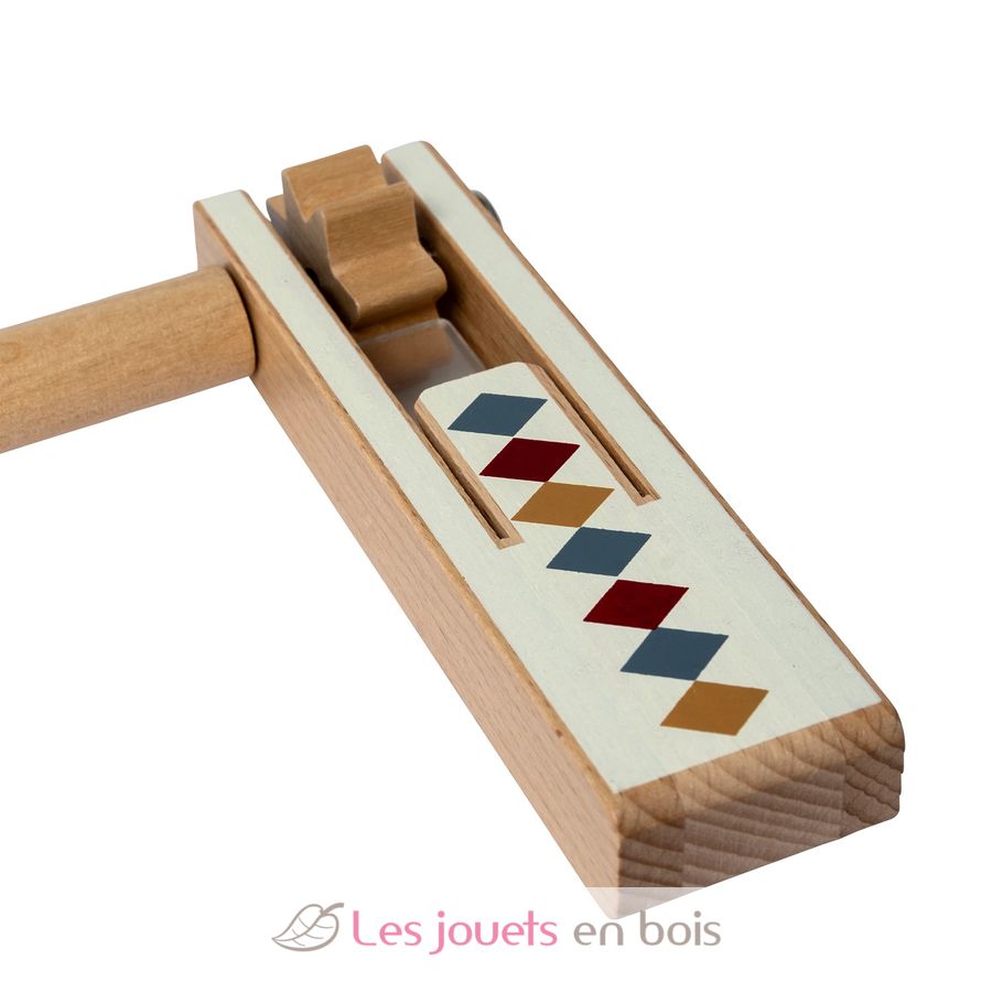 Laissez votre enfant explorer le monde de la musique avec la crécelle en bois de la collection de jouets musicaux Arlequin de chez Mamamemo.