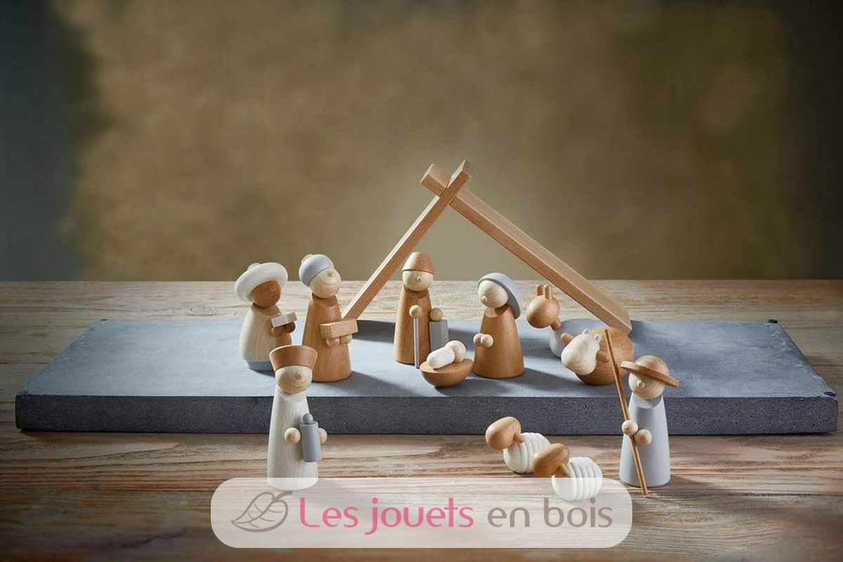 Cette jolie crèche de Noël contient une étable et des figurines en bois réinterprétées par Haba : Marie, Joseph, l'enfant Jésus, 3 Rois mages, 1 berger, 2 moutons, l'âne et le bœuf.