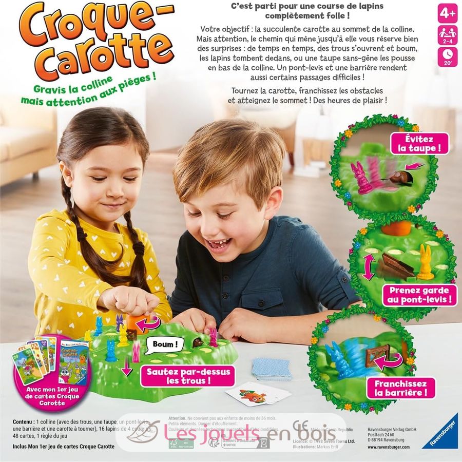 Croque Carotte est considéré comme un classique des jeux pour enfants avec ses diverses nominations et plus de 10 millions d'exemplaires vendus. Les règles sont simplissimes et s'apprennent en quelques secondes seulement ! Une fois le matériel installé sur la table, toute la famille est prête à jouer. Ce jeu permet d'initier en douceur les enfants aux premiers jeux de société. Après quelques parties et une fois que les enfants sont à l'aise avec le matériel de jeu, ils sont même capables de jouer seuls sans avoir besoin d'un adulte !