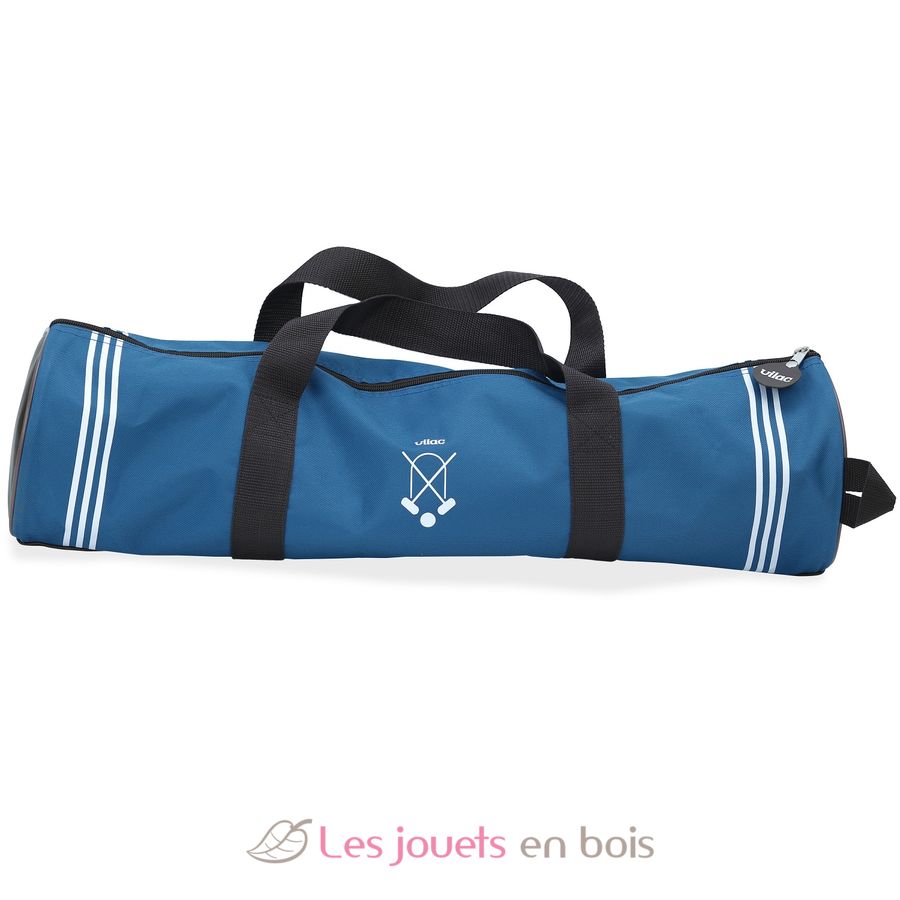 Ce croquet en bois, fabriqué en France, est livré dans sa housse en toile épaisse inspirée des sacs de golf, pratique et élégante pour le transport et le rangement.