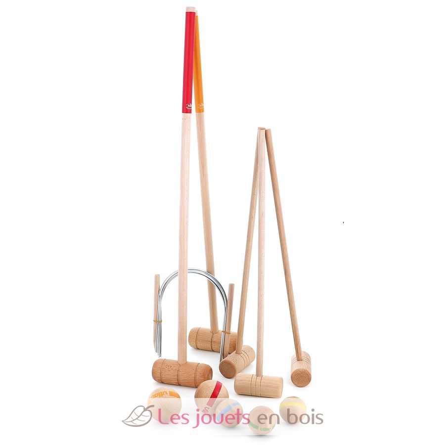 Le bois massif offre une solidité incomparable et une prise en main agréable, tandis que les balles colorées, les piquets et les arceaux en métal assurent un jeu fluide et précis.
