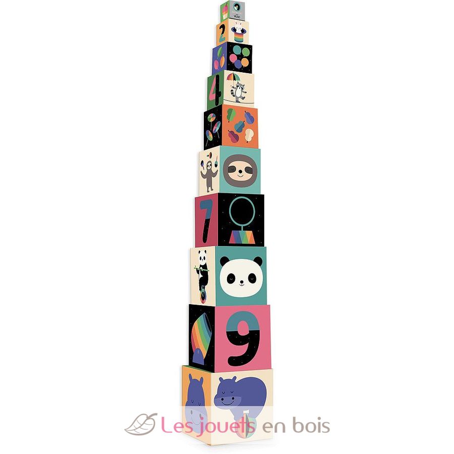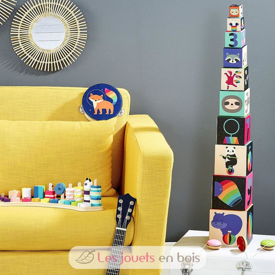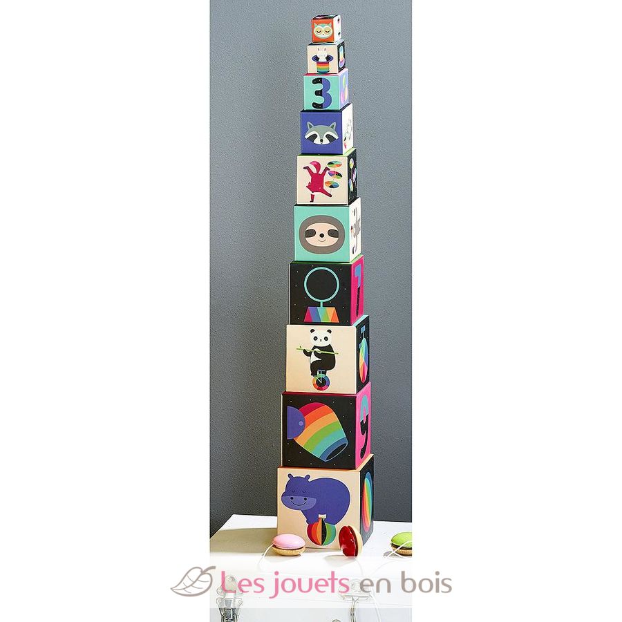 Dès 2 ans, les enfants découvrent de nouvelles notions pour apprendre à trier par taille, empiler, encastrer, observer et compter. Sur chaque cube, les enfants découvrent un animal différent faisant un numéro de cirque. Sur les autres faces, on retrouve un objet associé à ce numéro, un portrait de l'animal et enfin un aliment répété autant de fois que le chiffre indiqué sur la dernière face.