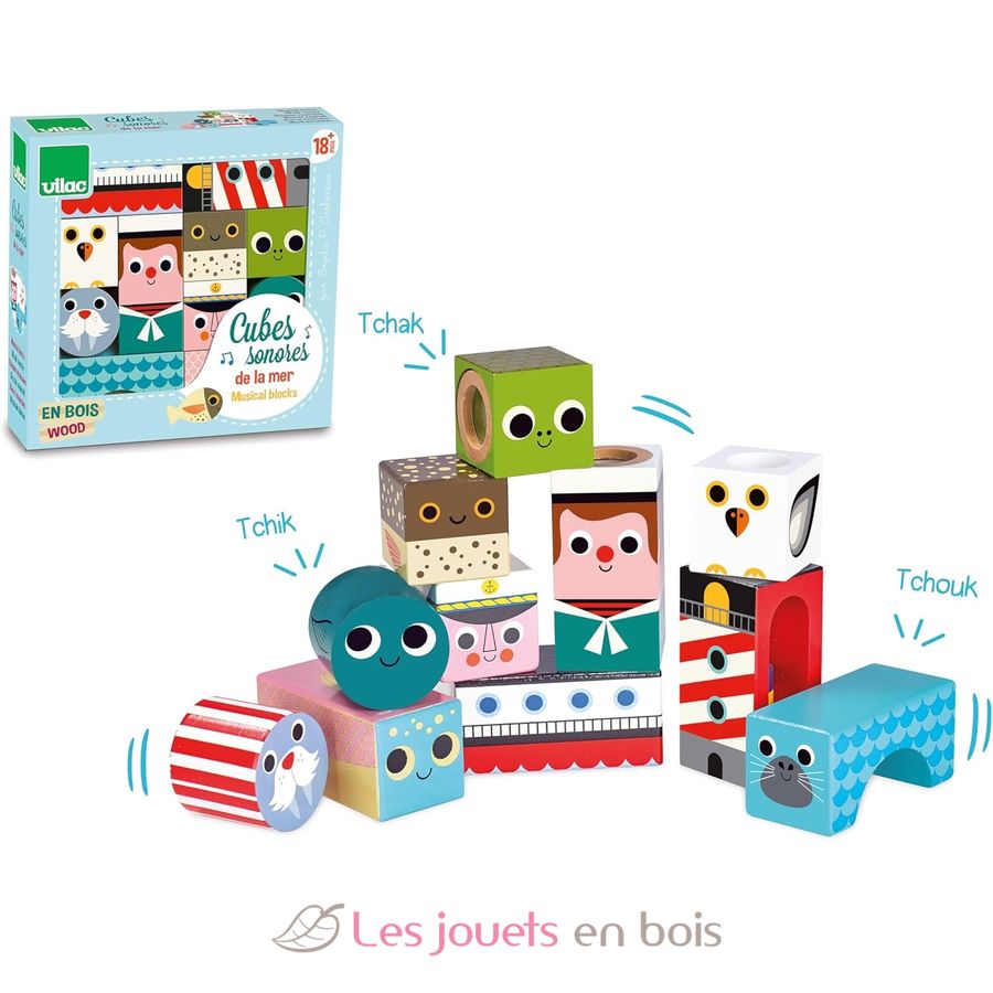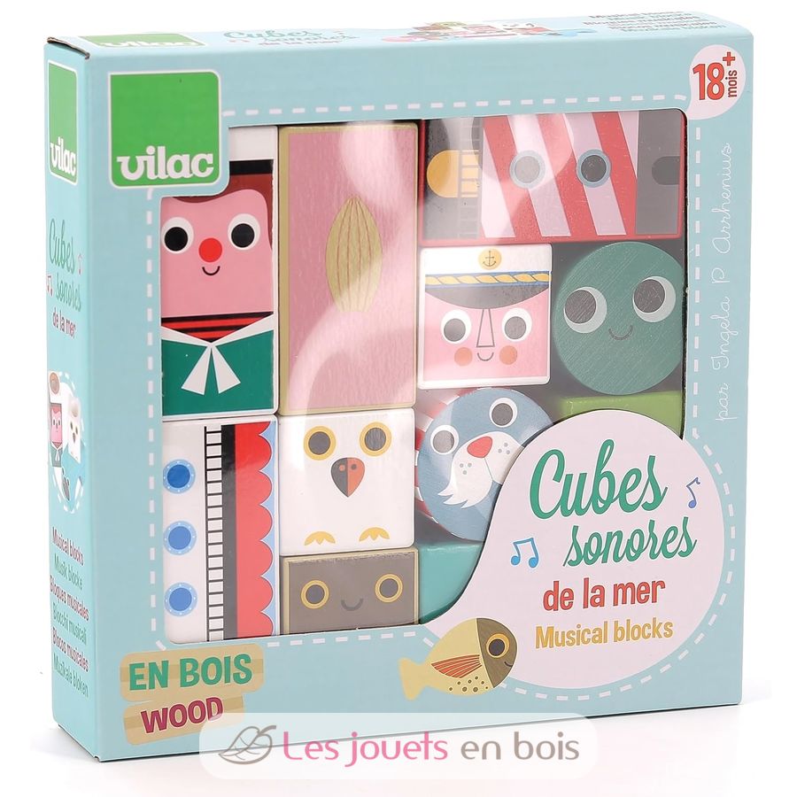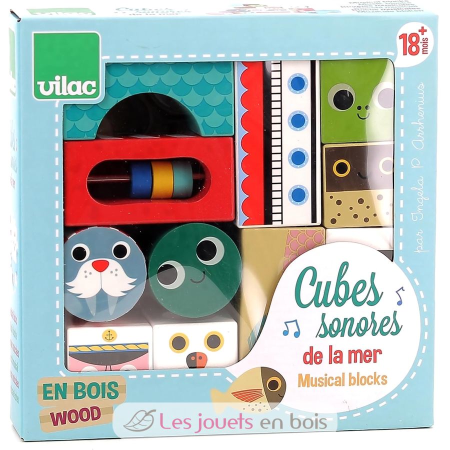 Apprendre à toucher, manipuler tout en découvrant des sons ? C'est possible avec les cubes sonores de la mer de la marque Vilac. Référence 7718.