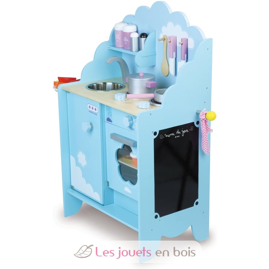 Pour les futurs chefs, cette cuisine sera le cadeau idéal pour des heures de jeu. Poupées et nounours seront les premiers à déguster de bons petits plats! Cuisine dans les nuages VILAC, une jolie petite cuisine en bois très colorée avec l'évier, 2 plaques de cuisson, 1 four et 1 réfrigérateur. Il y a même un tableau noir sur le côté pour écrire le menu à la craie. Sur l'autre côté, 1 tablette et 1 accroche torchon ! Livrée avec tous les accessoires : casseroles, ustensiles, salière, poivrière, boites d'aliments, pizza, cup cake...