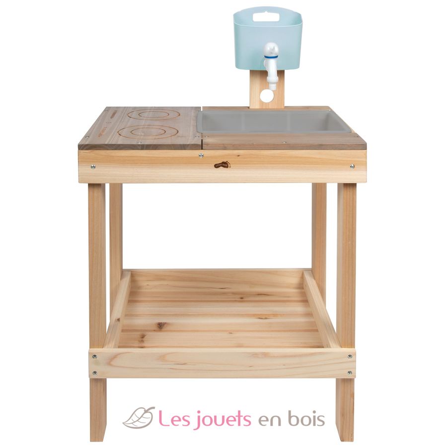 Un format compact pour s’amuser comme des fous dans la boue ! Cette cuisine en bois massif séduit par son plan de travail laqué gris résistant aux intempéries avec plaque de cuisson et commande tactile factice gravée, son distributeur d'eau amovible avec robinet, son évier en plastique robuste et beaucoup de place pour ranger des choses grâce à un grand bac de rangement dans la partie inférieure.