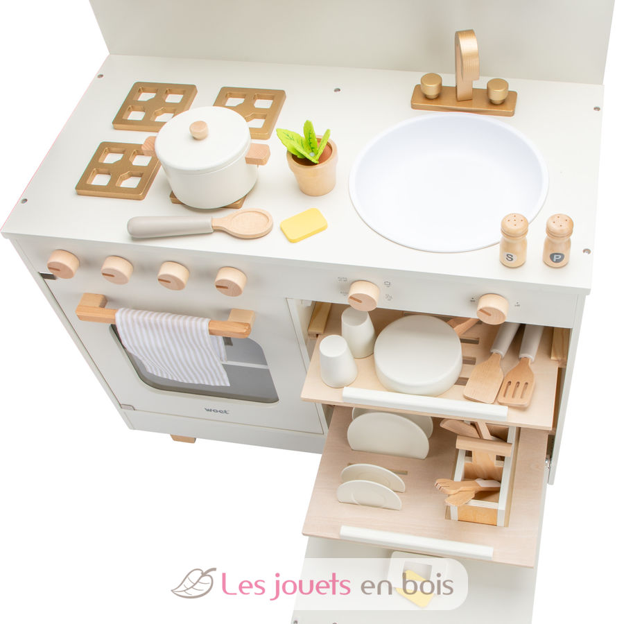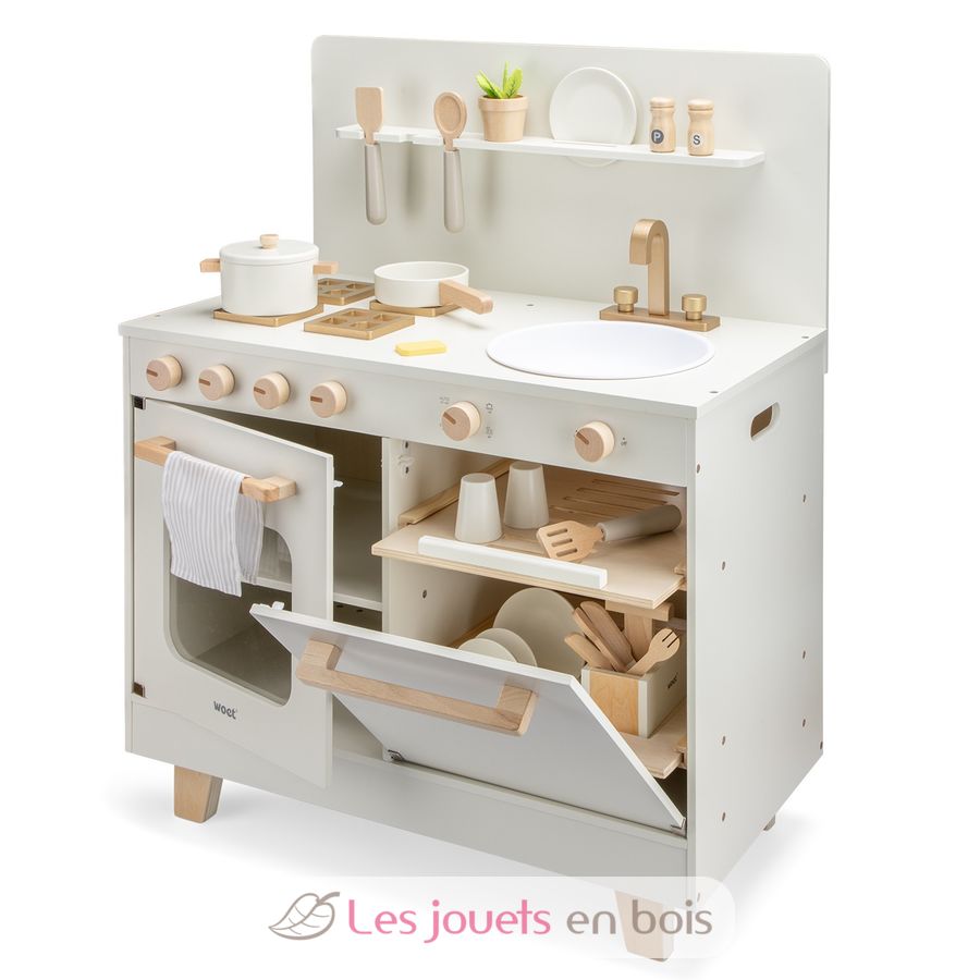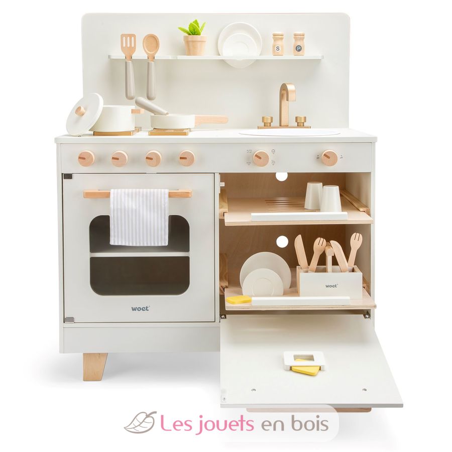 Cette cuisine en bois pour enfant dispose d'un lave-vaisselle intégré avec range-couverts, ce qui ajoute une touche ludique et réaliste en permettant aux plus petits de reproduire les routines du quotidien.