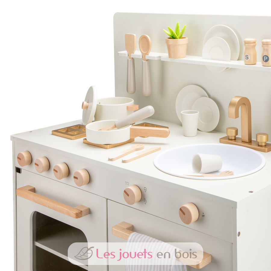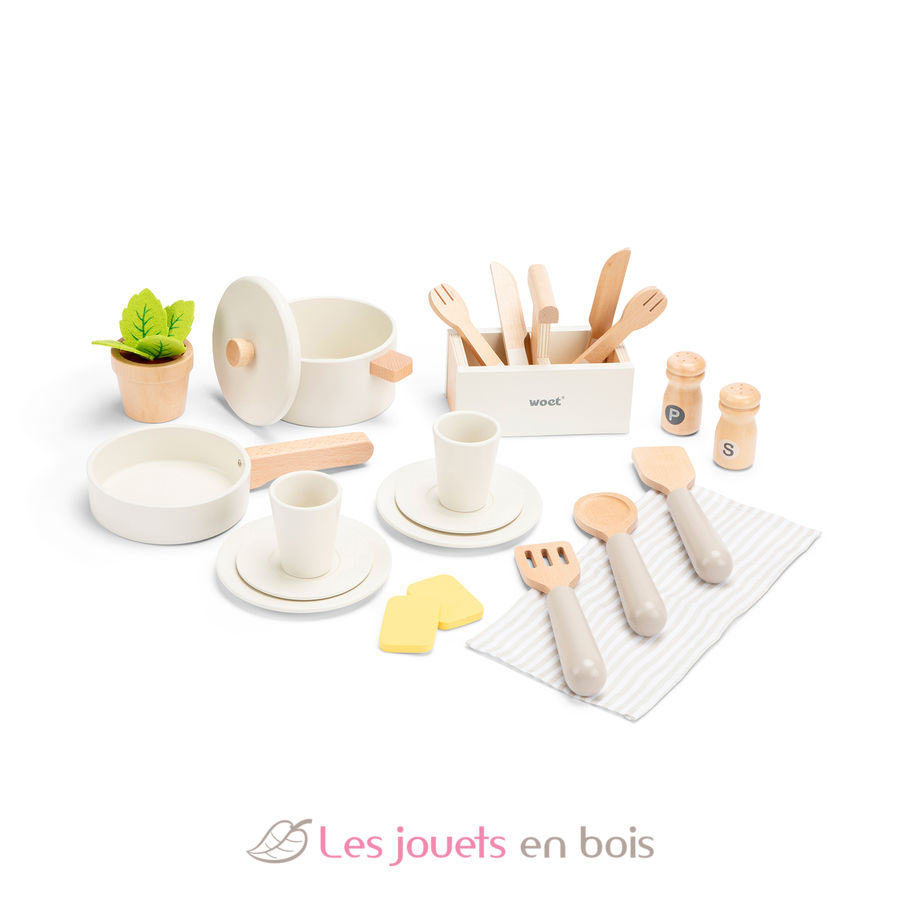 Cet ensemble de jouet d'imitation comprend plus de 20 accessoires en bois, des casseroles, des poêles, des assiettes, des ustensiles et un pot d'herbes aromatiques en bois, pour des heures de jeu de rôle enrichissant.