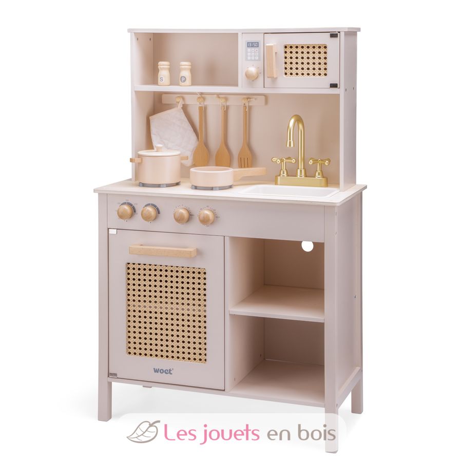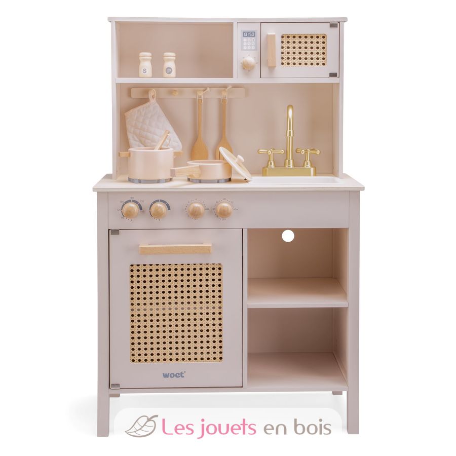 Cuisine en bois et rotin rose, une cuisine pour enfant de la marque New Classic Toys. Référence 11046.
