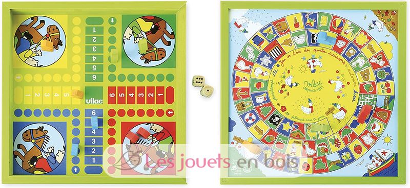 Un joli jeu de l'oie et un jeu de petits chevaux dans un coffret en bois massif. Sous le couvercle de bois de ce coffret, deux incontournables jeux de société pour les petits. Ce jeu de société de grande qualité est fabriqué dans le Jura en France par Vilac. Réf 6117