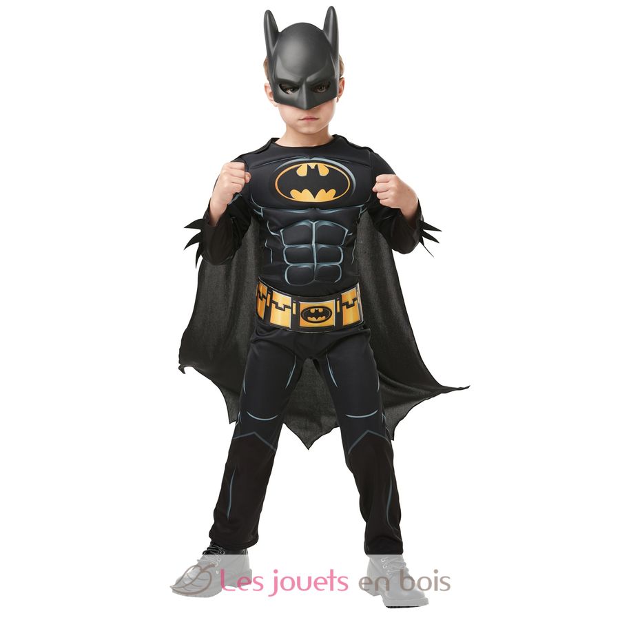 Ce déguisement pour enfant comprend comprend une combinaison à manches longues en jersey imprimée noire et jaune avec muscles rembourrés, une ceinture en tissu et mousse, une cape avec attaches scratch sur les épaules et un masque PVC noir à l’effigie de Batman avec attache élastique à l’arrière. Votre enfant se sentira comme un vrai super-héros !