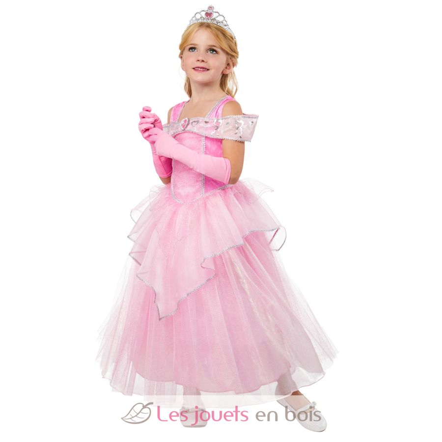 Ce déguisement pour enfant comprend une robe de princesse rose scintillante, une tiare et des gants.
