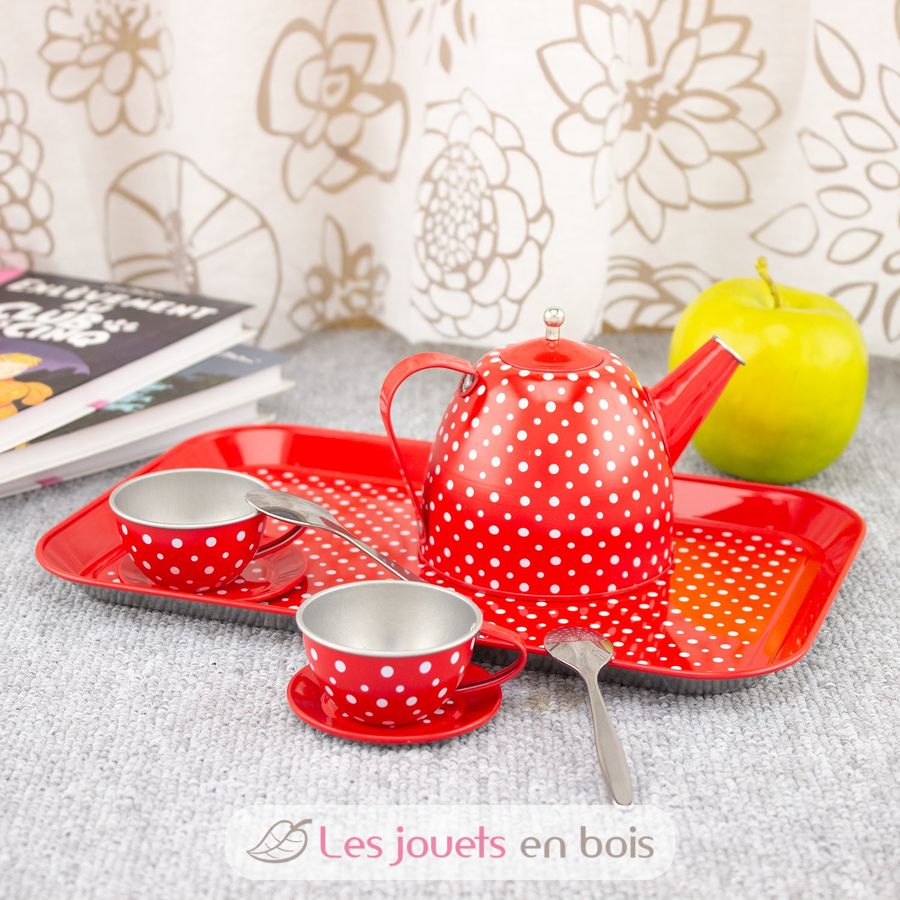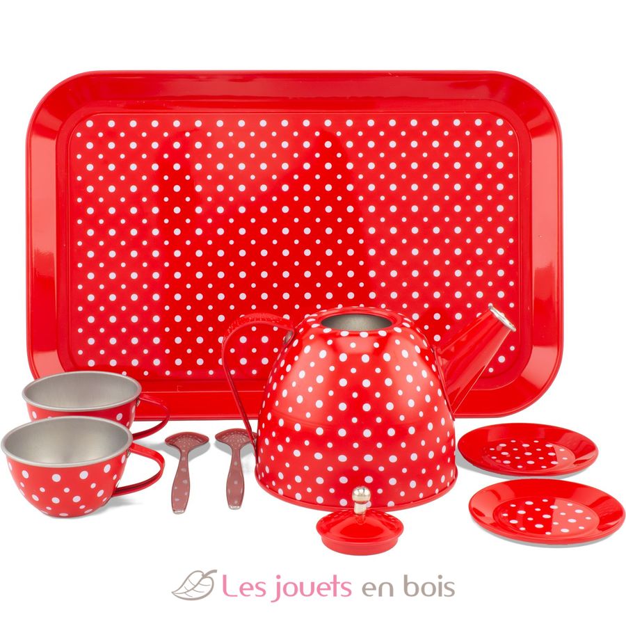 Ce service à thé en métal contient 1 théière avec couvercle, 1 plateau (24,5 x 16 cm), 2 tasses, 2 sous-tasses et 2 petites cuillères. Parfait pour encourager le jeu créatif et les tea parties imaginatives !
