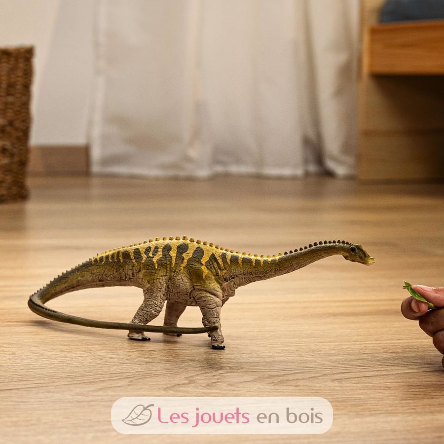 Le diplodocus est un géant de la préhistoire : il mesure 27 mètres de long, dont six mètres rien que pour son immense cou. Qui plus est, il peut peser jusqu’à 16 tonnes alors qu’il est végétarien ! Avec sa large gueule, il doit mastiquer péniblement des branches pendant des heures avant d’être enfin rassasié. Cette activité l’occupe donc un bon moment !
