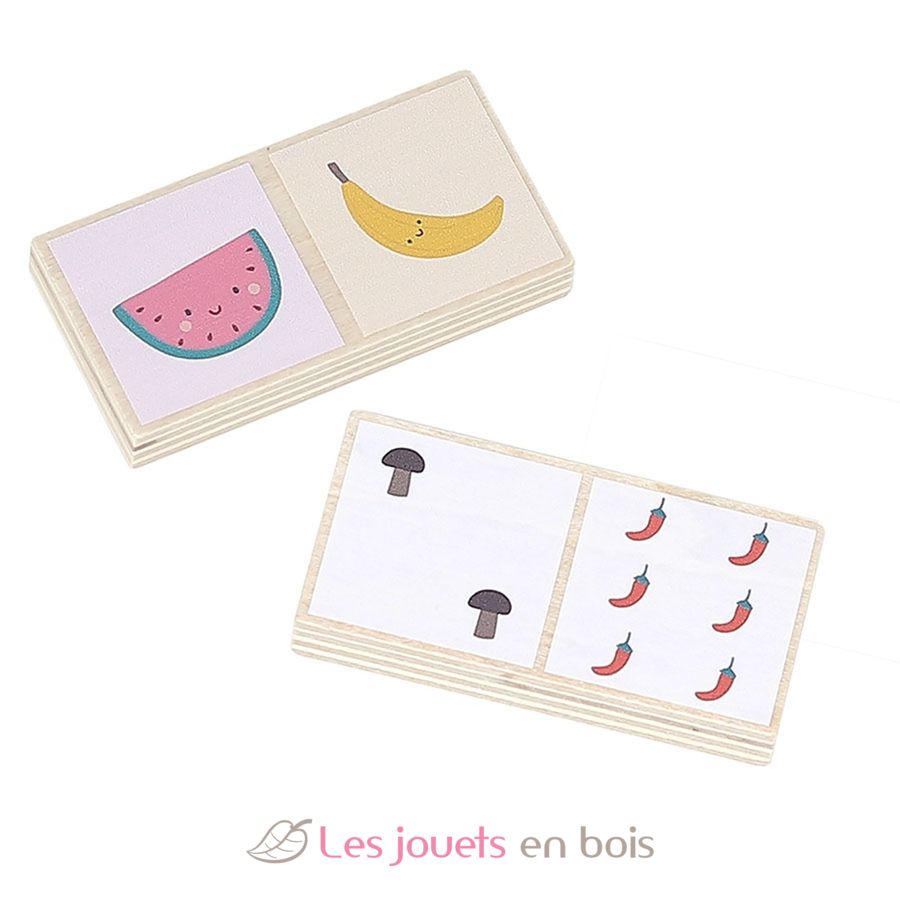Ces dominos sont réversibles : une face pour associer les fruits, l’autre face pour associer les nombres (représentés par des légumes). Idéal pour de bons moments de jeu en famille, dès 2 ans.