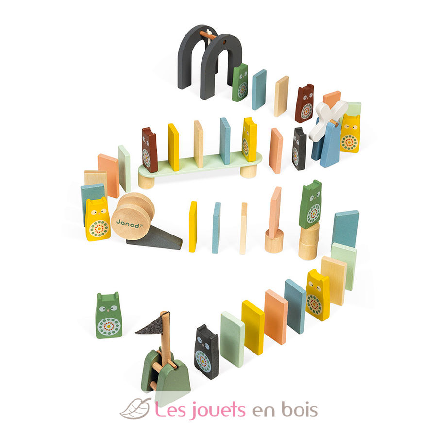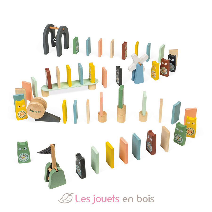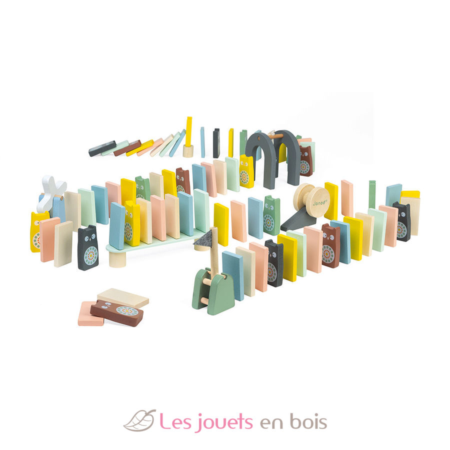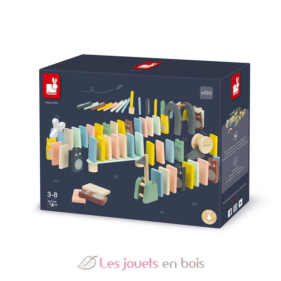 Cette boîte contient 100 dominos en bois aux couleurs pastel pour des heures de construction de circuits et de cascades de dominos !