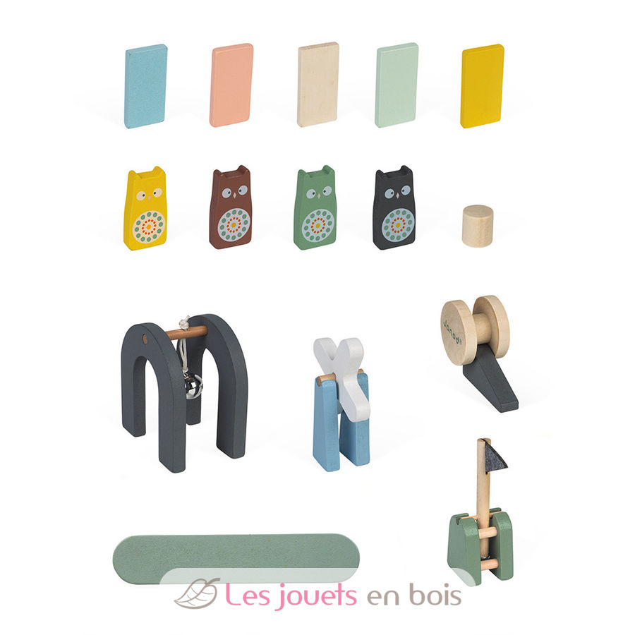 Ces dominos permettent de construire un parcours semé d'embûches pour les jolis dominos hiboux (plots, pont, moulin, drapeau, clochette, pente et bobine). Ce jeu de dominos en bois est idéal pour développer la dextérité et la patience de votre enfant tout en s'amusant.
