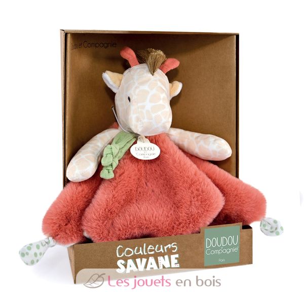 Doudou plat girafe beige et rouge 25 cm. Référence DC4073.