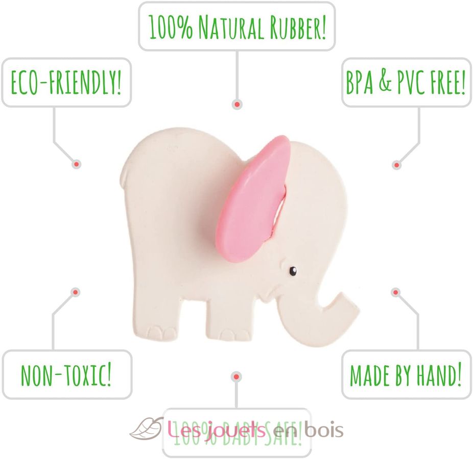 L’elephant rose de dentition de LANCO est fabriqué en caoutchouc naturel issu de la sève d’hévéa cultivé de façon responsable. Naturel, sans traitement chimique et peint avec des colorants alimentaires il est le produit d’un travail artisanal. Chaque anneau de dentition LANCO est unique car assemblé et décoré à la main. Et comme tous les jouets LANCO TOYS, il peut accompagner bébé dans son bain !