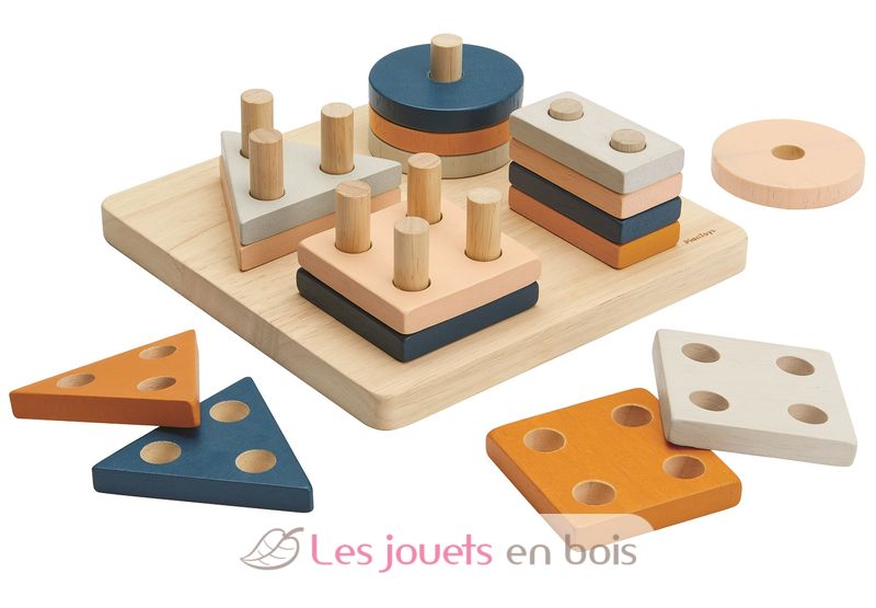 Empilages géométriques Couleurs Tendresse, un jeu d'empilement et d'encastrement en bois de la marque Plan Toys. Réf. PT5476.