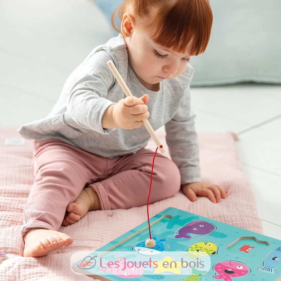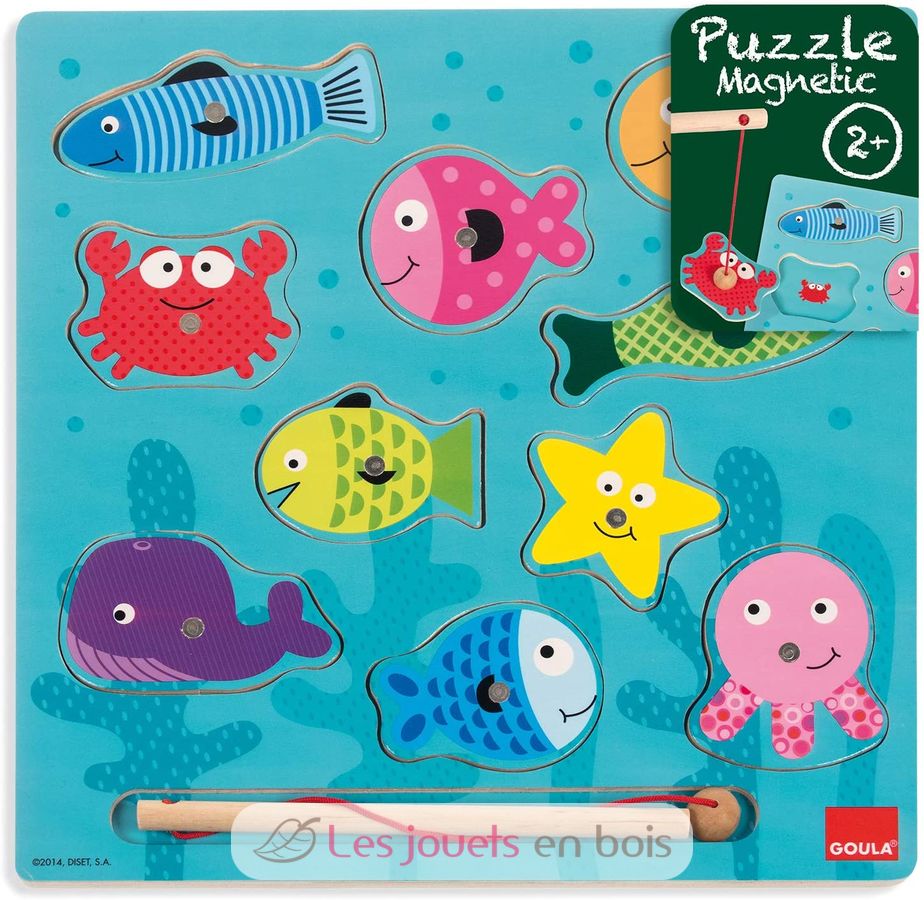 Un puzzle en bois de 10 pièces magnétiques. L’enfant s'amuse à associer les animaux marins à leur silhouette puis, à les attraper à l'aide de la canne à pêche magnétique.