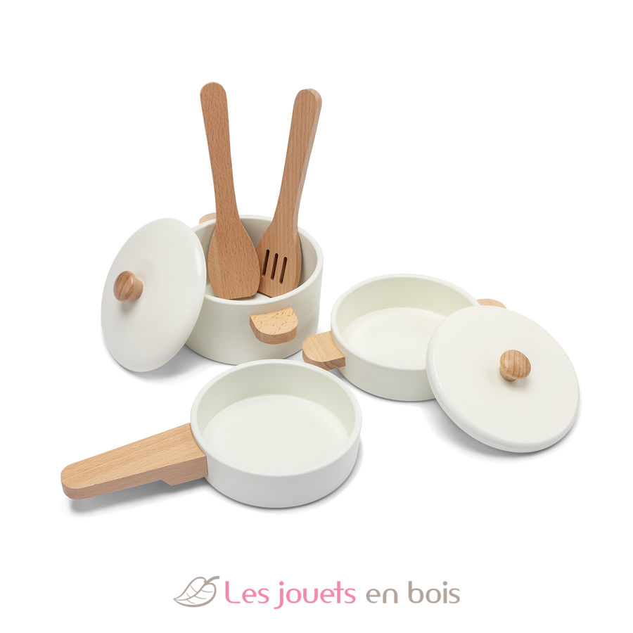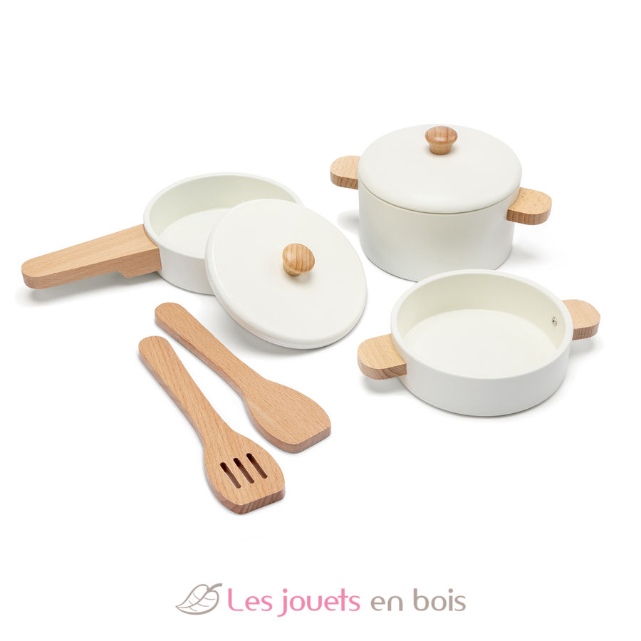 Les casseroles sont en bois de couleur blanc cassé avec des poignées en bois naturel certifié 100% FSC.