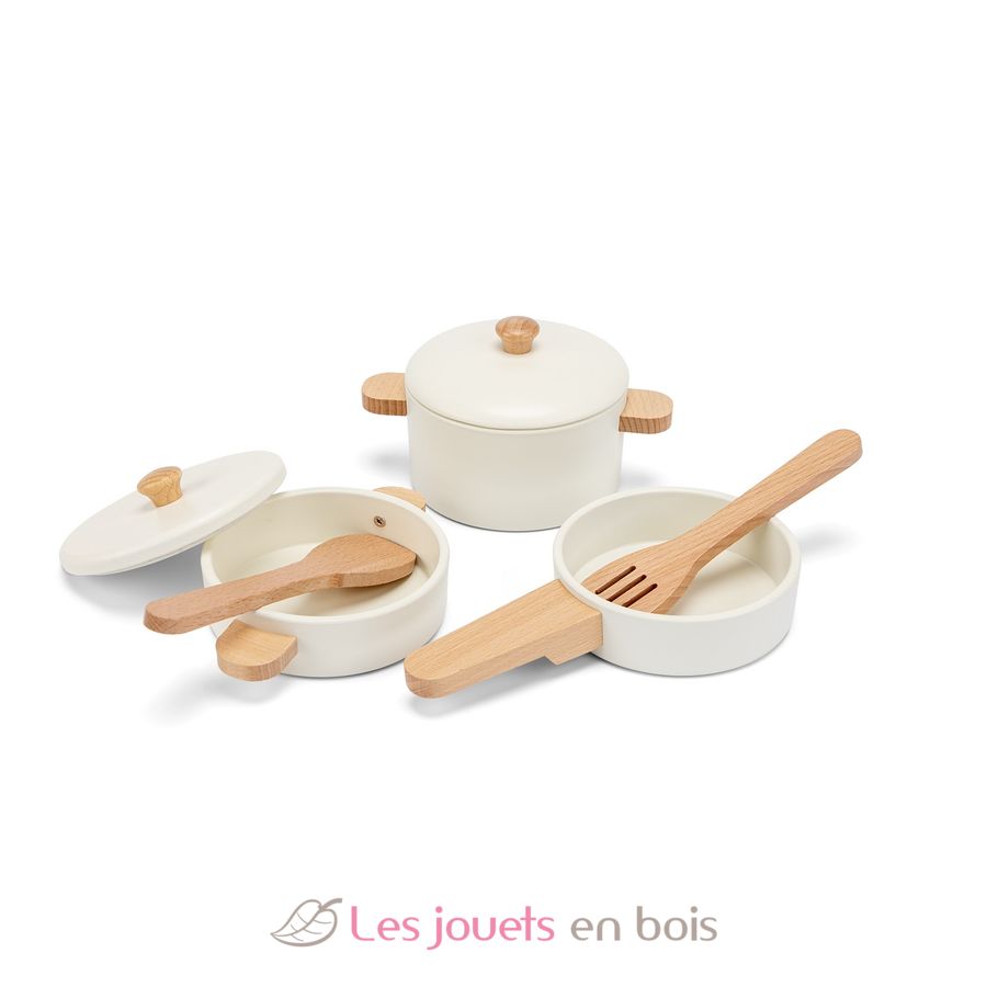 Ensemble de casseroles en bois, un jouet d'imitation de la marque New Classic Toys. Référence 10645.