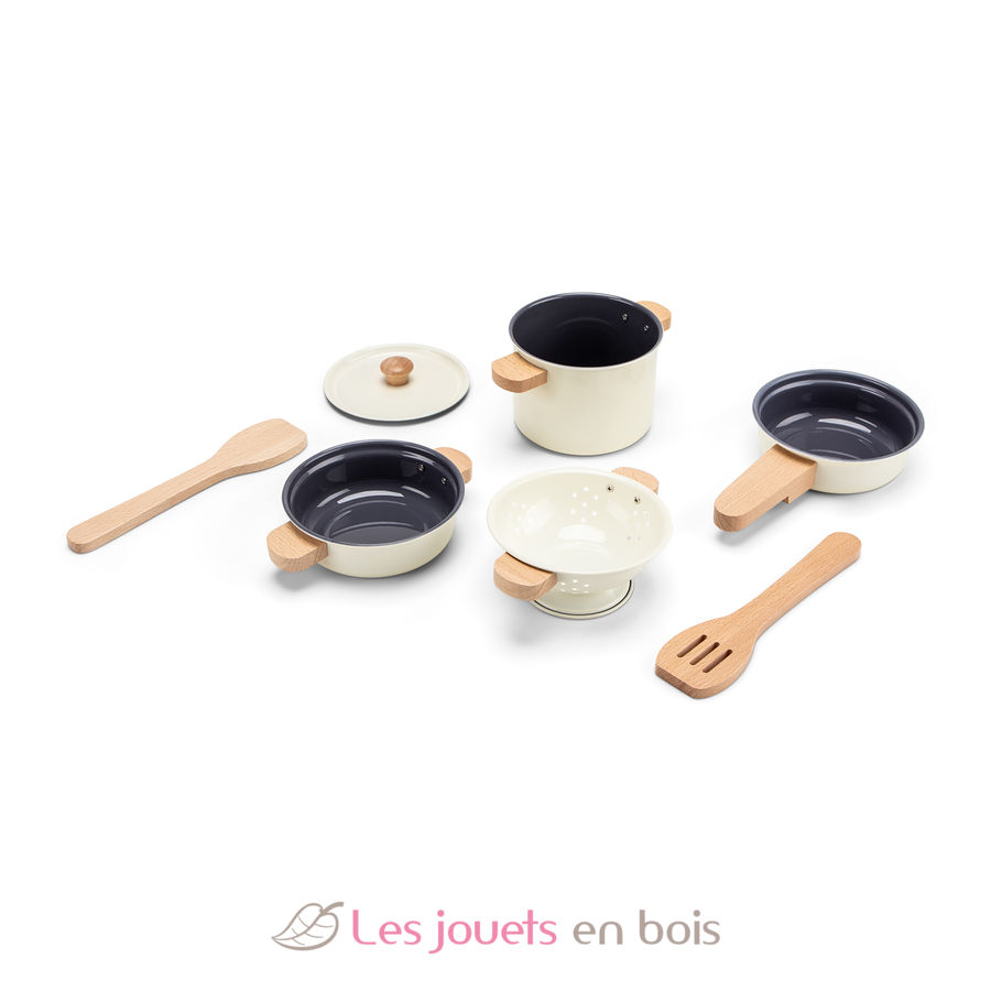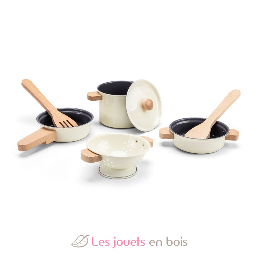 Cet ensemble de casseroles en métal est le complément parfait à toute cuisine d'enfant. Cet set de dinette de 7 pièces se compose de deux casseroles dont une avec couvercle, d'une poêle et d'une passoire. L'ensemble comprend également deux spatules en bois, afin que les petits puissent remuer leurs plats pendant la cuisson.