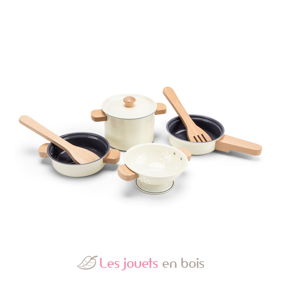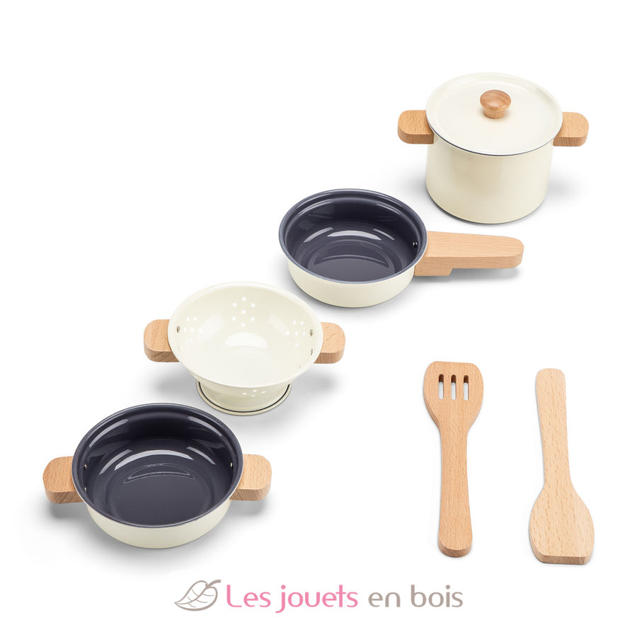 Les casseroles sont en métal de couleur blanc cassé avec des poignées en bois certifié 100% FSC.