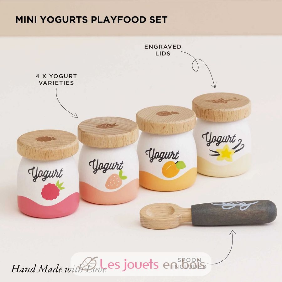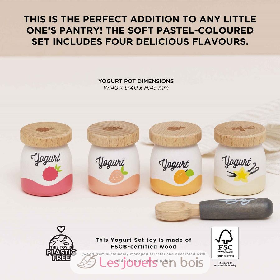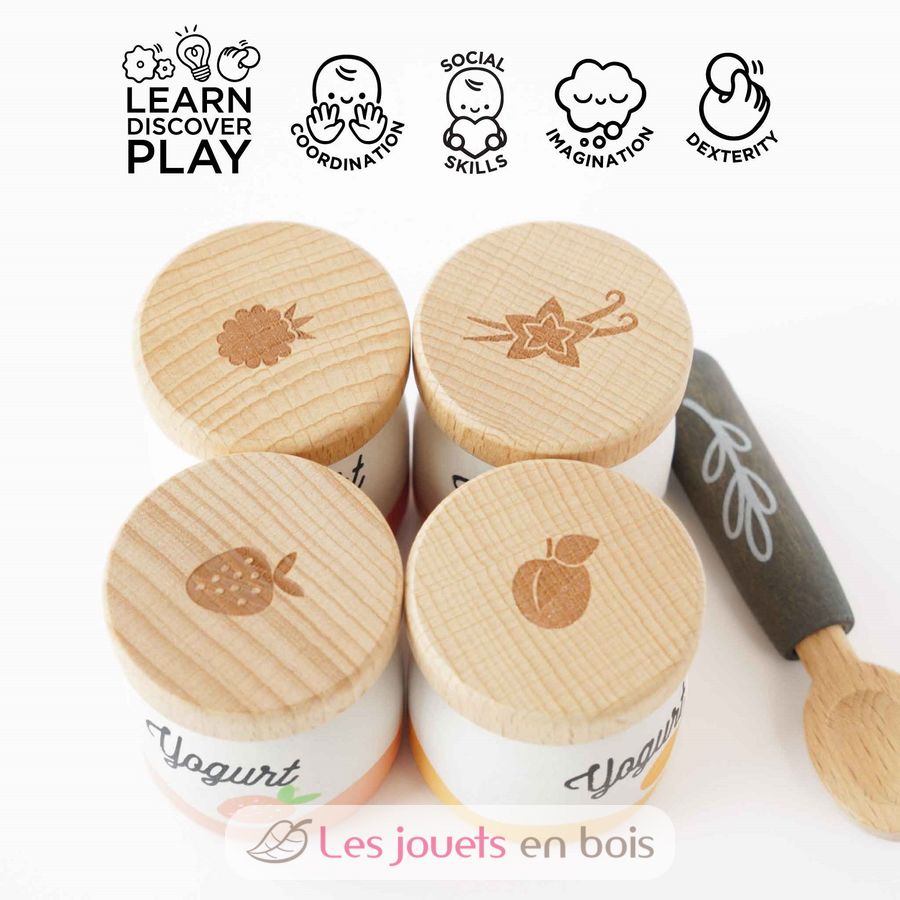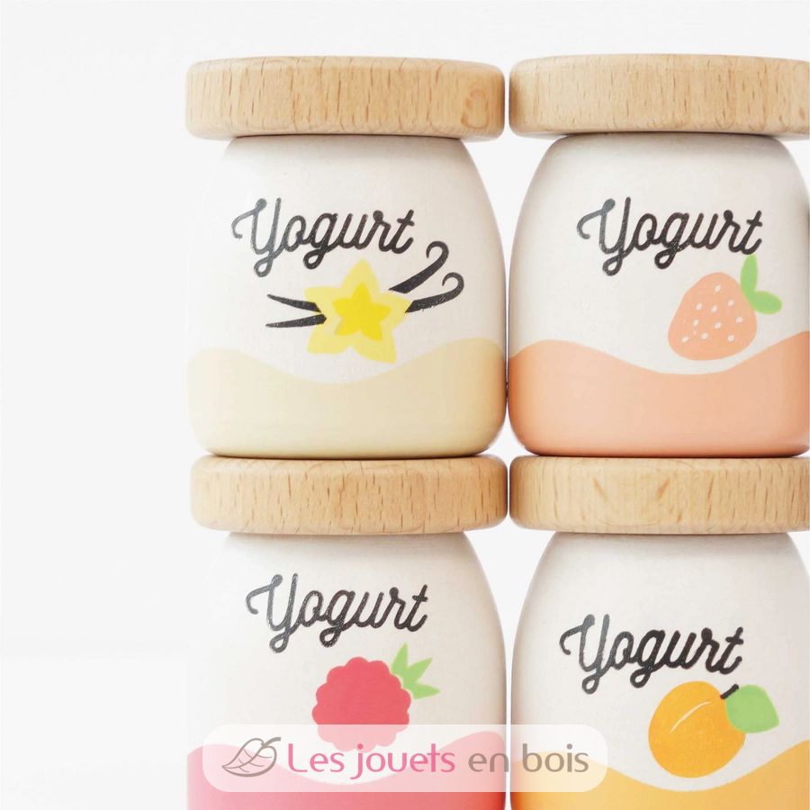 Cet ensemble aux couleurs pastel douces comprend 4 pots de yaourts en bois aux saveurs abricot, vanille, framboise et fraise (taille d'un pot 4 x 4 x 4,9 cm).