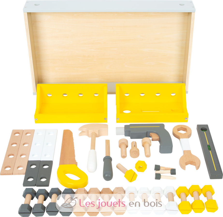 Point fort de cet établi pour enfant : les enfants peuvent participer à la construction de l'établi ! Il est fourni avec 8 outils et de nombreux accessoires.