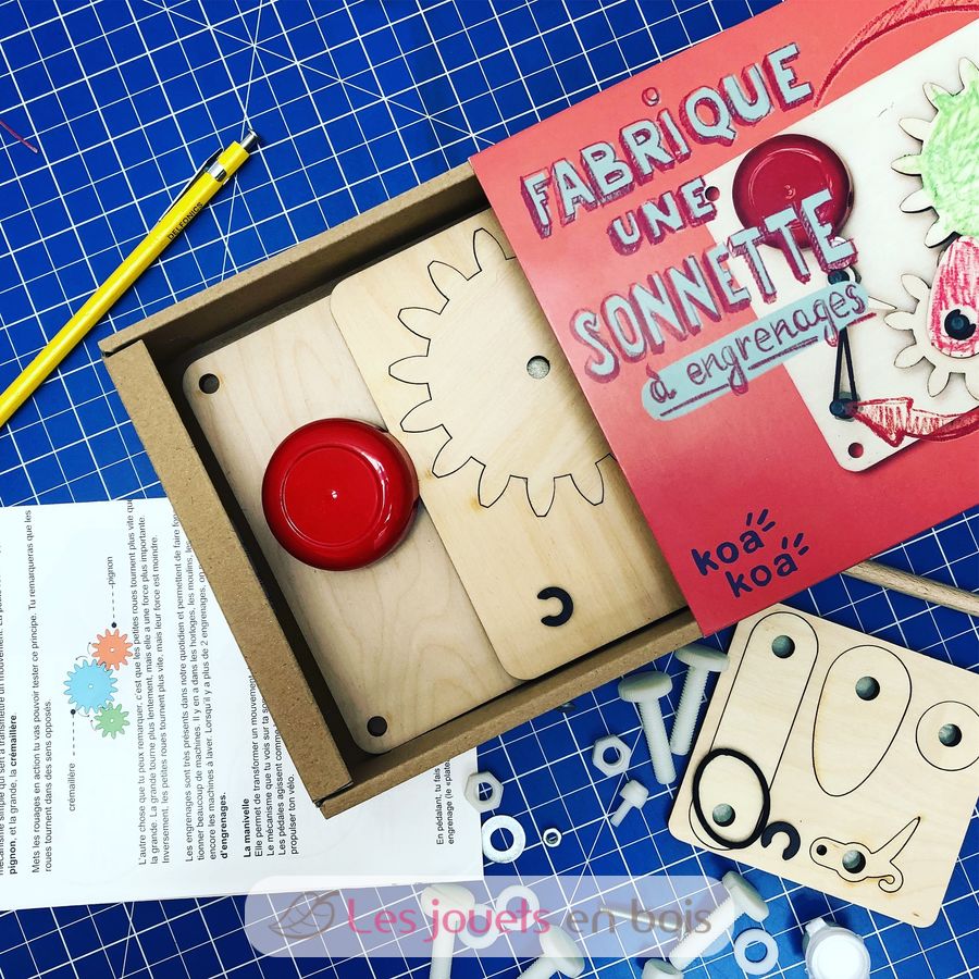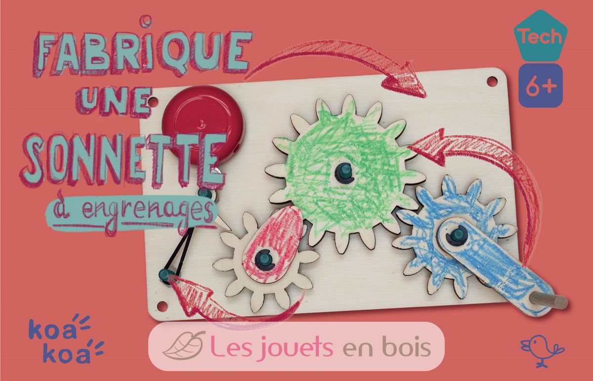 Ce kit contient tout ce qu’il faut pour construire une sonnette de porte pour ta chambre. Une fois assemblée, tourne la manivelle : les engrenages enclenchent le marteau qui vient taper la sonnette. Pour une sonnette entièrement fait maison et à ton goût, peins-la avec tes couleurs préférées !