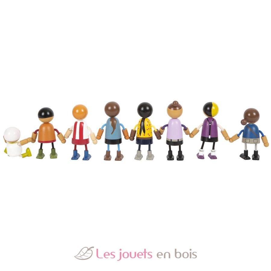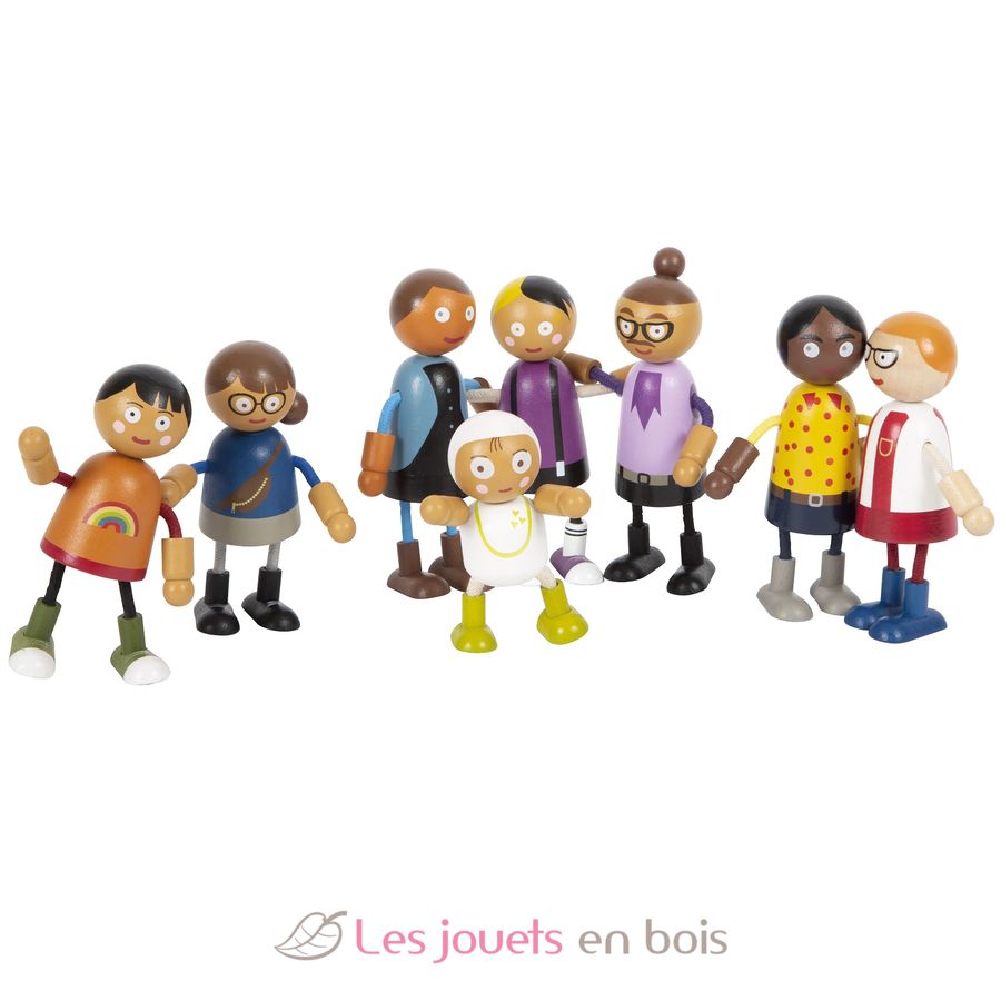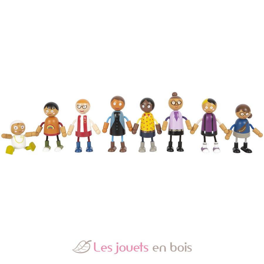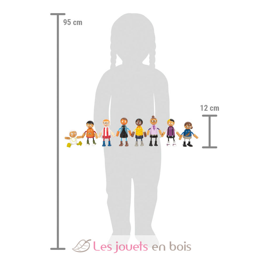 Cette grande famille de poupées soupes en bois est composée de 8 membres de famille. Les poupées souples ont une tête et un torse en bois solide, tandis que leurs bras et jambes flexibles sont adaptés à tous jeu de rôle dans la maison de poupées.