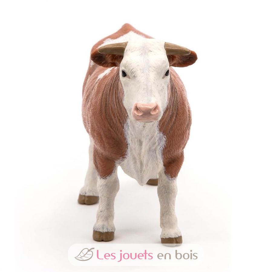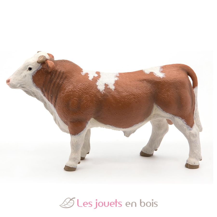 Figurine Taureau simmental, une jolie figurine sur le thème de lavie à la ferme, peinte soigneusement à la main et modelée de façon très réaliste. Les figurines Papo deviendront rapidement la base d'une collection à enrichir progressivement pour l'éveil et la découverte de votre enfant
