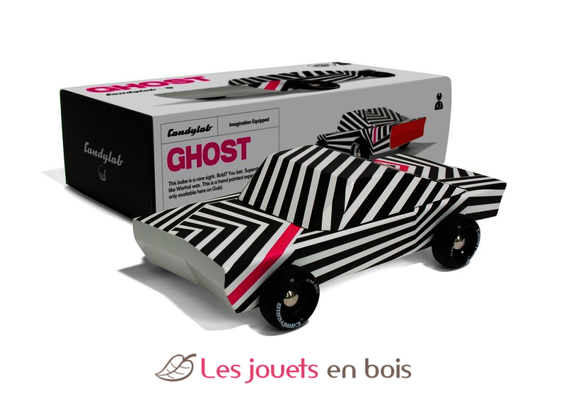 Carrosserie rayée noir et blanc pour cette voiture en bois "Ghost" reconnaissable entres toutes. Disponible en quantités limitées. Candylab, réf M0402.