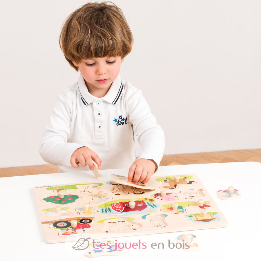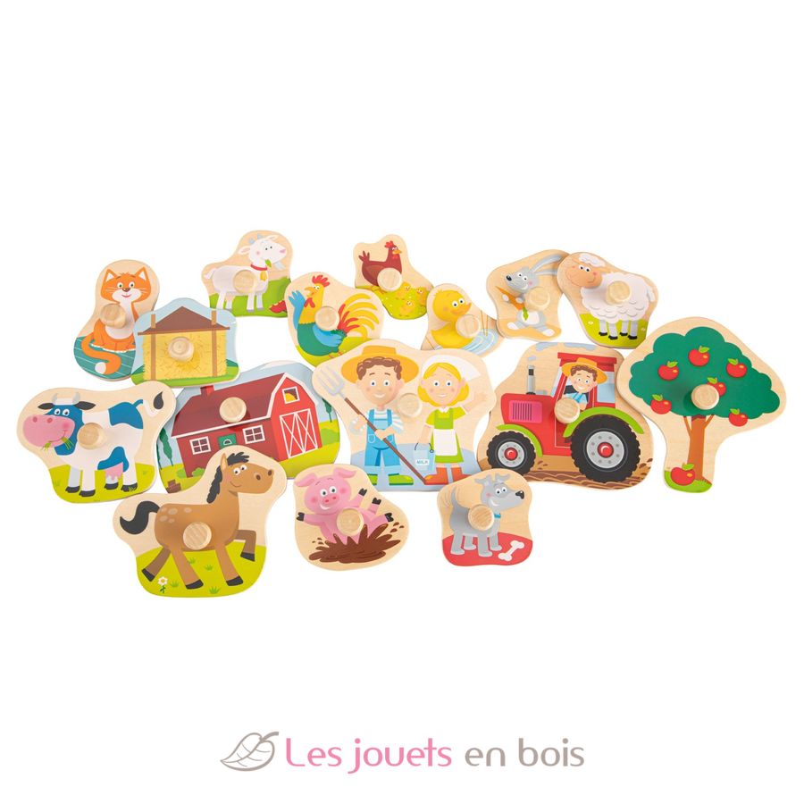 Ce puzzle d'encastrement, fabriqué en bois certifié 100% FSC, se compose de 16 pièces que l'enfant s'amusera à replacer au bon endroit : une grange à foin, un chat, une vache, un tracteur, un poulet, un coq, une ferme, un canard, un mouton, un chien, un cochon, un cheval, un lapin, une chèvre, un pommier et les fermiers.