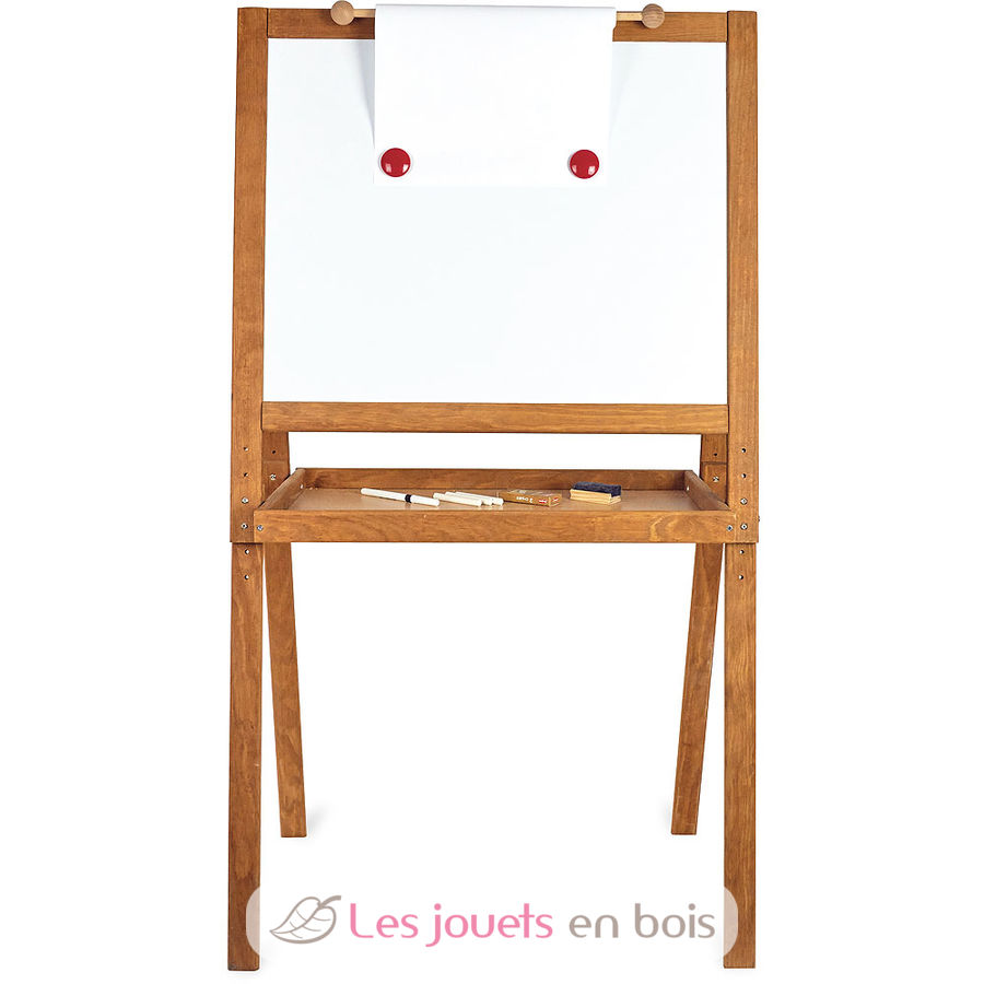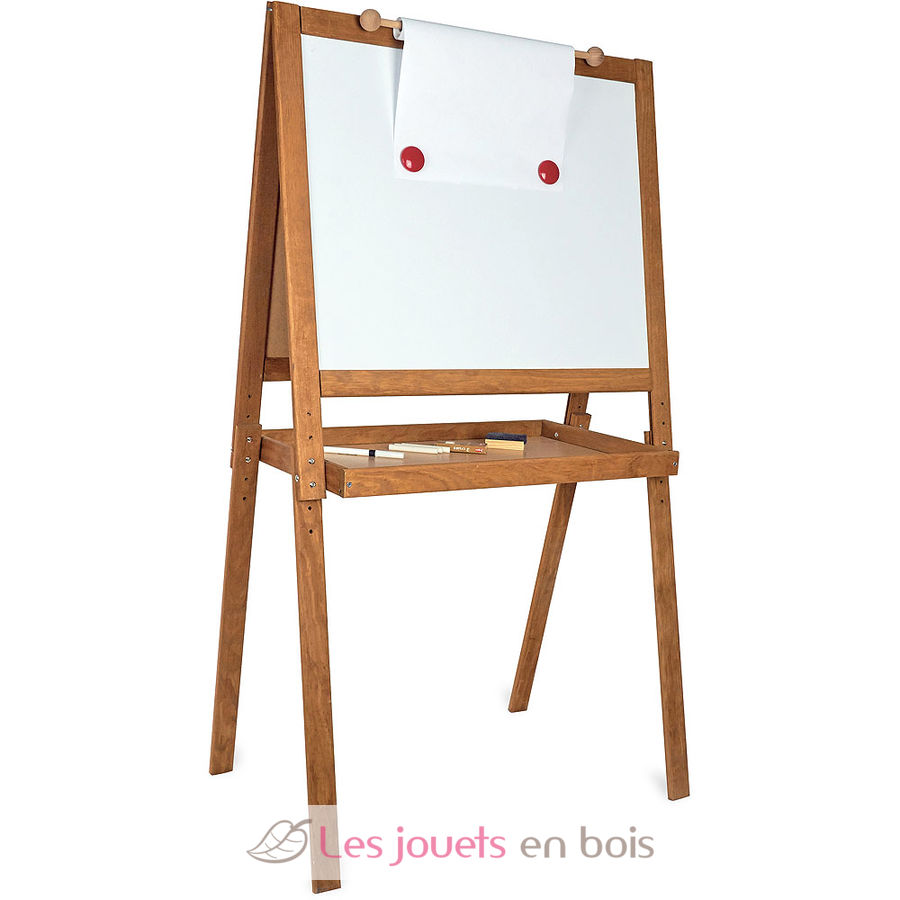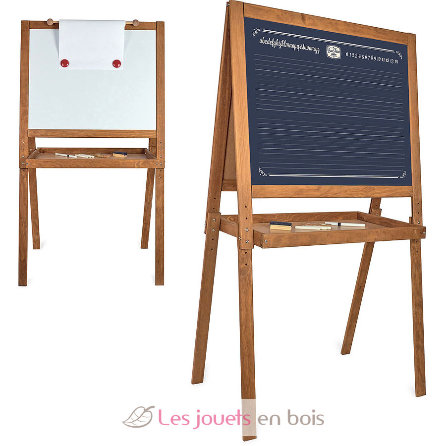 Le grand tableau d'écolier en bois Vilac et son look rétro est le cadeau idéal pour les jeunes artistes qui pourront jouer au maître ou à la maîtresse, ou encore tout simplement s'entraîner à écrire et dessiner. Ce grand tableau est réglable en hauteur pour s'adapter à la taille de l'enfant. Ce chevalet d'écolier sur pied dispose de deux faces différentes : un tableau en ardoise pour écrire et dessiner à la craie et un tableau magnétique pour magnets et feutres effaçables. Ce grand tableau d'écolier Vintage est livré avec ses accessoires : une brosse, une boîte de craies, un feutre effaçable, deux magnets et un rouleau de papier.
