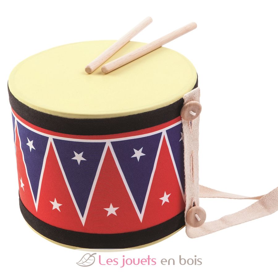 Fabriqué en bois d'hévéa, ce tambour pour enfant est recouvert d'une peau en caoutchouc naturel. Il dispose d'une lanière réglable qui permet de l'ajuster à la taille de l'enfant et de 2 baguettes conçues pour les petites mains.