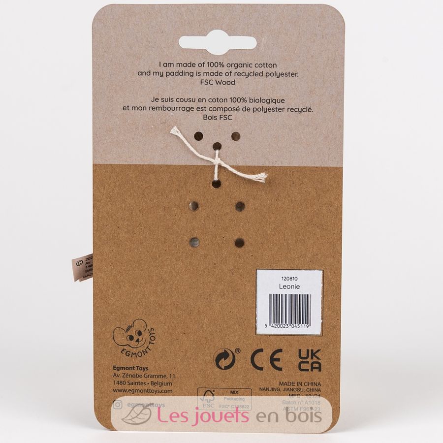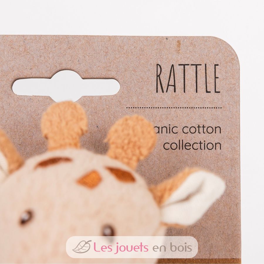 Accroché à l'anneau de bois, Léonie la girafe est confectionné en coton bio et polyester recyclé.