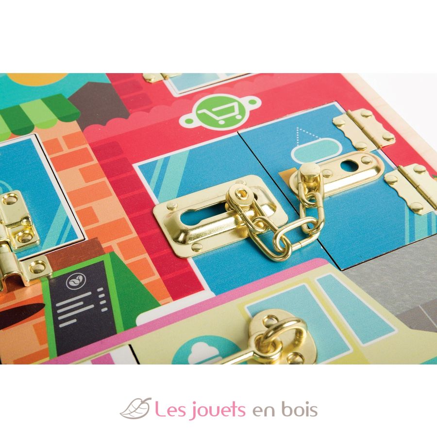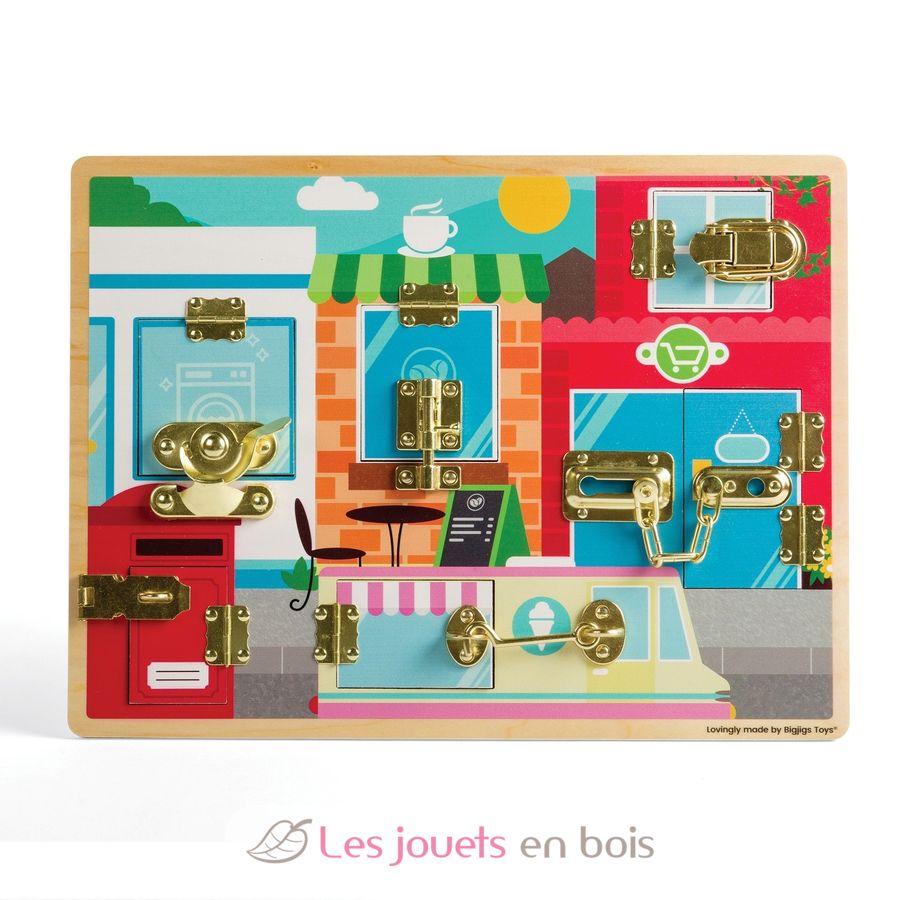 Jeu d'activités loquets et serrures, un tableau d'apprentissage de la marque Bigjigs Toys.