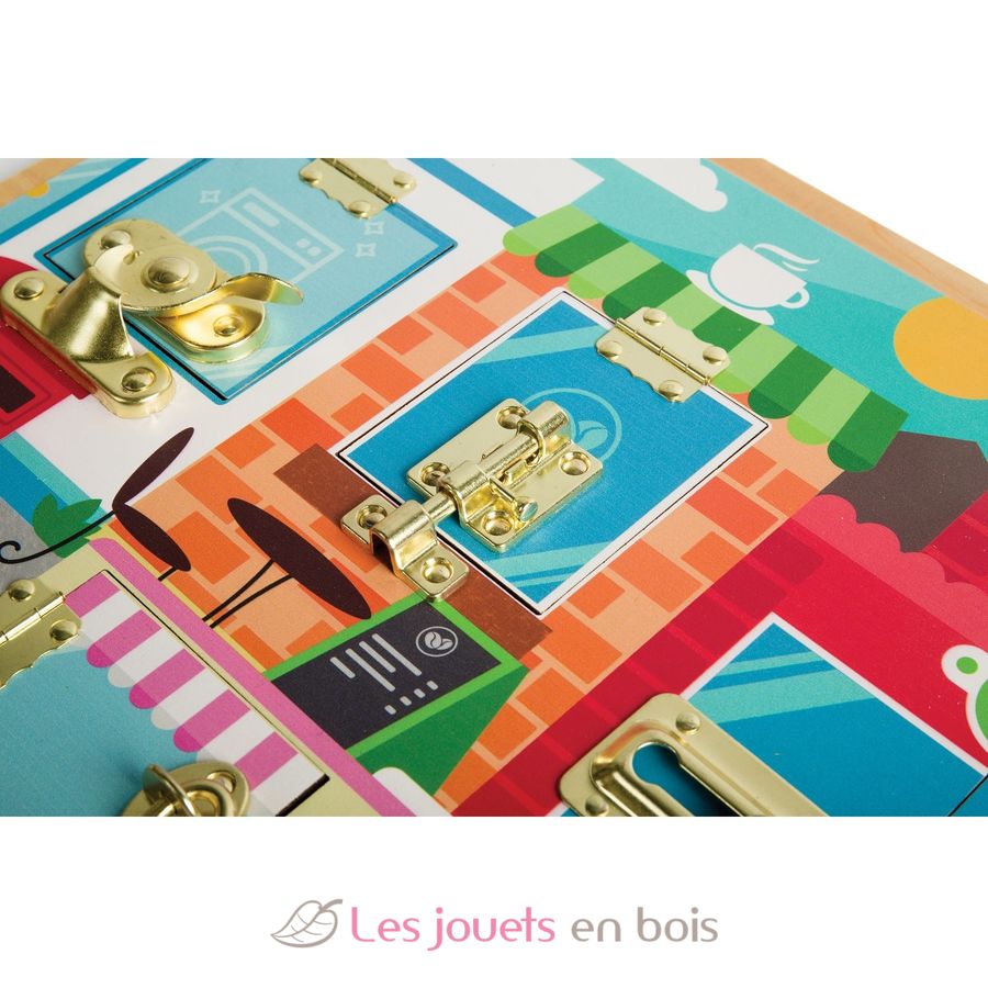 Une fois les enfants familiarisés avec l'ouverture des différents verrous, chaque porte de cette planche de motricité dévoile une scène détaillée. Préparez-vous à découvrir une laverie, la cuisine d'un café, un salon confortable, un sac de courrier, les rayons d'un supermarché et l'intérieur d'un camion de glaces.