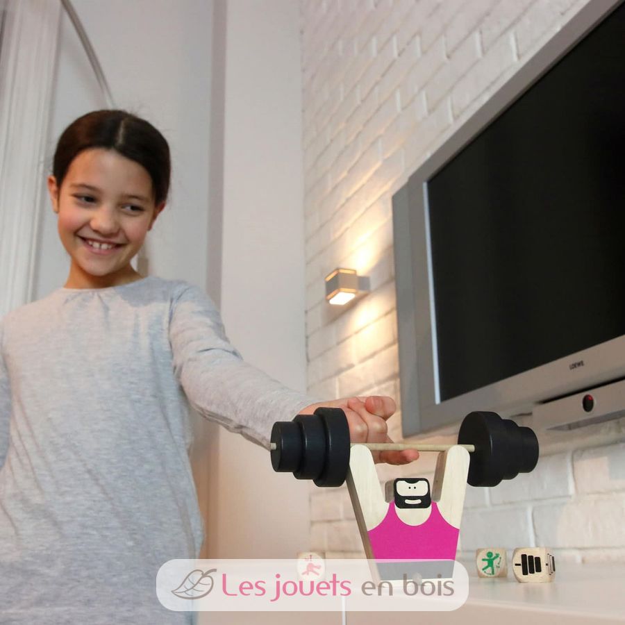 Réchauffez vos muscles, suivez le personal trainer et acceptez le défi le plus vacillant qui soit ! Affrontez vos amis dans des épreuves amusantes de coordination et d'équilibre. Chacun son tour, chargez la barre avec les poids, indiqués par le dé poids et placez-la sur l'athlète. Lancez le dé personal trainer (le dé vert pour des exercices plus faciles, le dé rouge pour des exercices plus difficiles) et, en soulevant la barre avec deux doigts unis, effectuez l'épreuve indiquée. Le gagnant est le joueur qui parvient à réaliser correctement le plus d'épreuves sans faire tomber les poids ! Un jeu avec 2 niveaux de difficultés pour s'amuser à tous les âges, dès 6 ans.