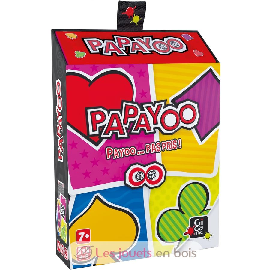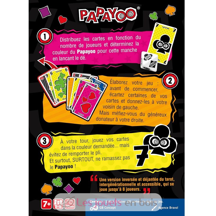 Dans ce jeu de cartes, il n’y a ni valets, ni reines, ni rois, mais une cinquième couleur, dite Payoo, plus un drôle de dé. Comment marquer le moins de points possible ? En évitant de récolter ces fichus Payoos et surtout le Papayoo, ce satané 7 dont la couleur change (maudit dé !) à chaque manche… Vous n’êtes pas satisfait de la donne ? Pas grave, vous donnez des cartes à votre gauche avant de commencer. Mais faites les bons choix, car elles seront remplacées par le « cadeau » venant de droite… Ensuite vous jouez la donne mais sans atouts et sans scrupules, pas sûr que le meilleur gagne !