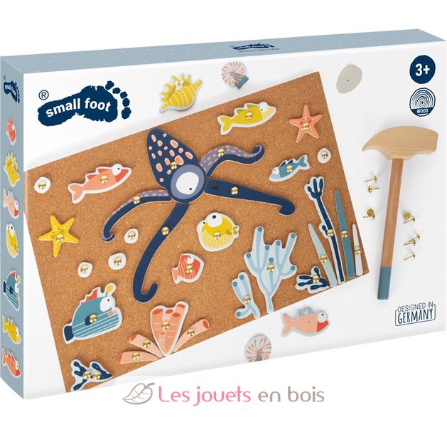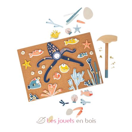Équipé d'une planche en liège, d'un marteau en bois, de clous décoratifs et de différents éléments d'image en bois stratifié, ce jeu de martelage permet de créer de nombreux motifs du monde sous-marin.