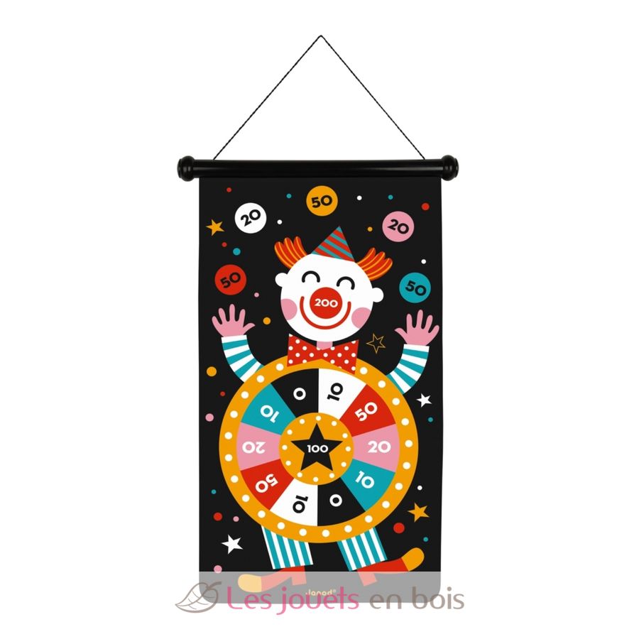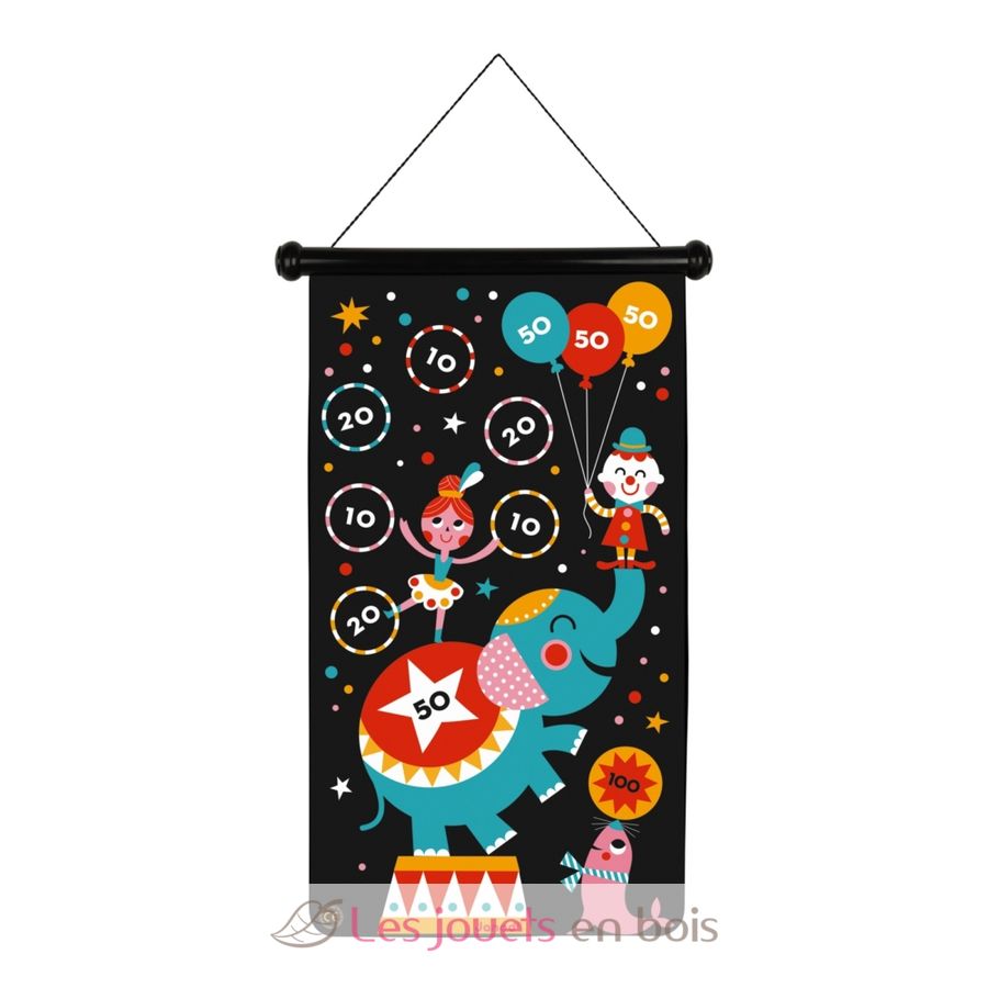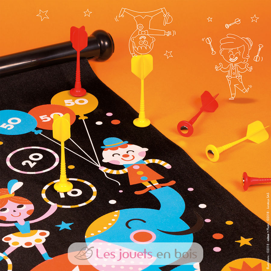 Voici un joli jeu de fléchettes magnétiques sur le thème du cirque ! Le tissu est imprimé de chaque côté pour un double niveau de jeu afin d’amuser les plus petits comme les plus grands. Grâce à sa cordelette il est facile à suspendre. Ce jeu inclut 6 fléchettes (3 rouges et 3 jaunes) en plastique aimantées. Il se range facilement dans sa boîte en l’enroulant.