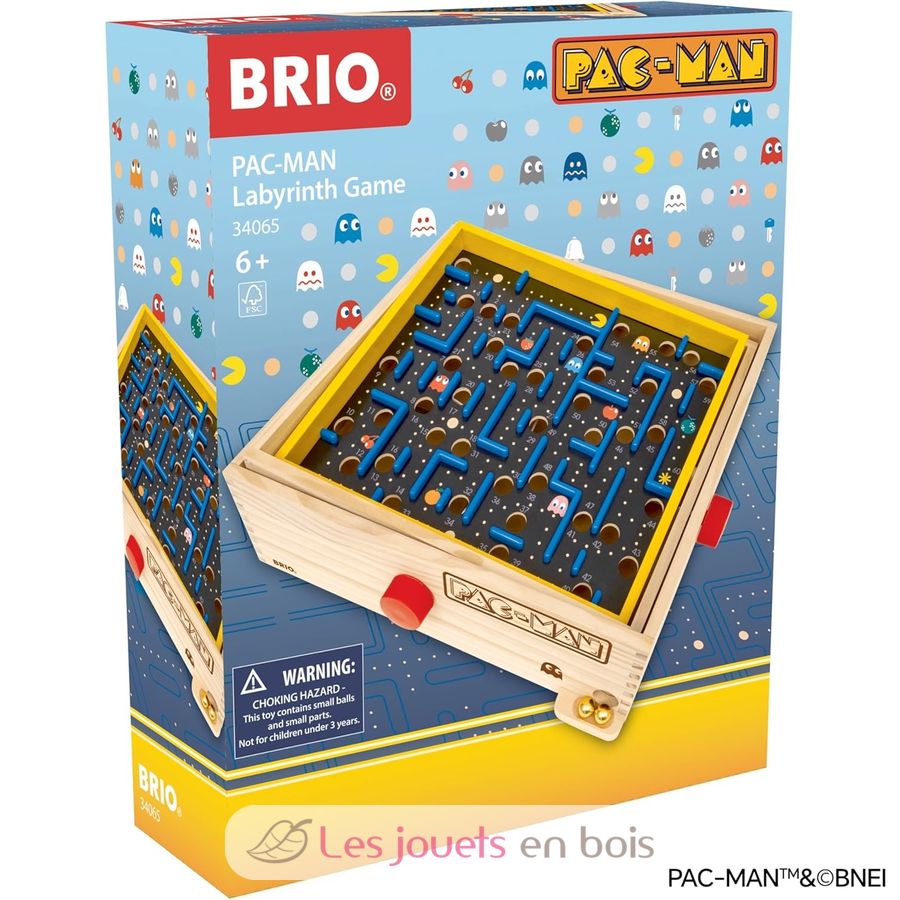 Jeu de Labyrinthe Pac-Man, un jeu en bois de la marque Brio. Livré avec 2 billes en métal doré. Pour les joueurs à partir de 6 ans.