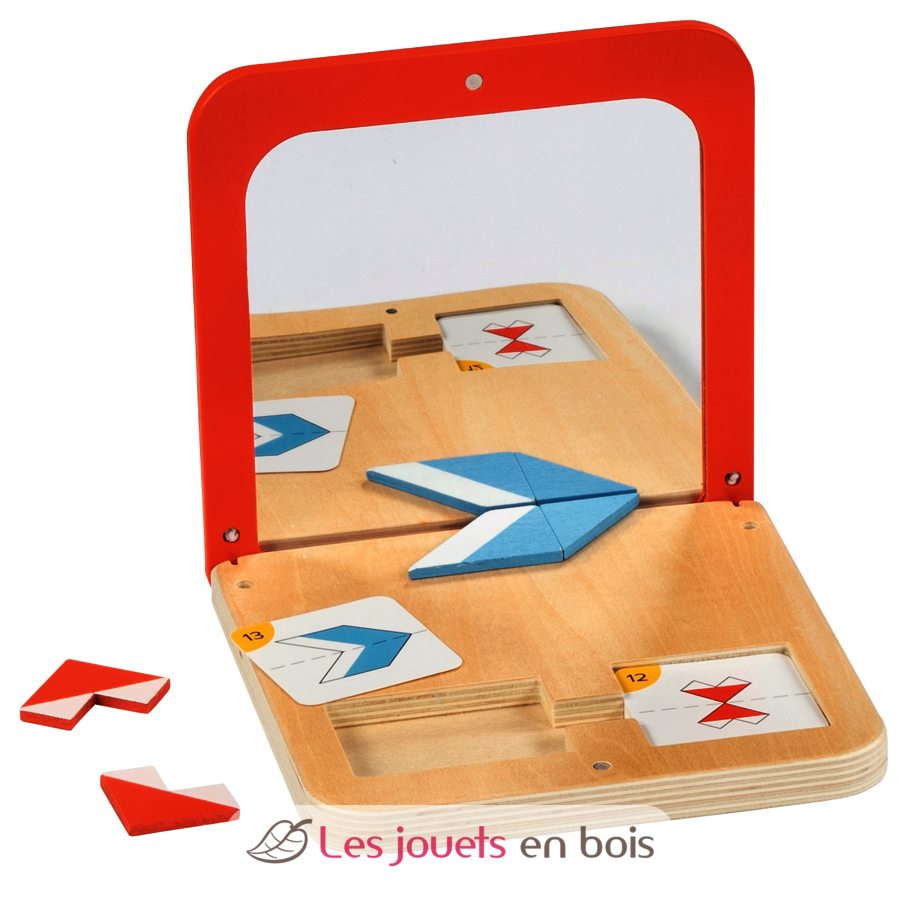 L'enfant doit bien regarder sa carte et disposer correctement face au miroir les pièces à sa disposition. En utilisant le reflet, il pourra reproduire à l'identique l'image présente sur sa carte de défi.