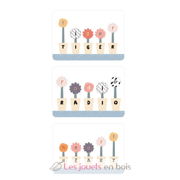 26 pots de fleurs avec des lettres majuscules et 26 fleurs avec des lettres minuscules accompagnent les enfants dans l'apprentissage des lettres. Les enfants assemblent les lettres qui vont ensemble et découvrent l'alphabet. Avec les cartes de mots incluses, ils s'entraînent à épeler leurs premiers mots en anglais.