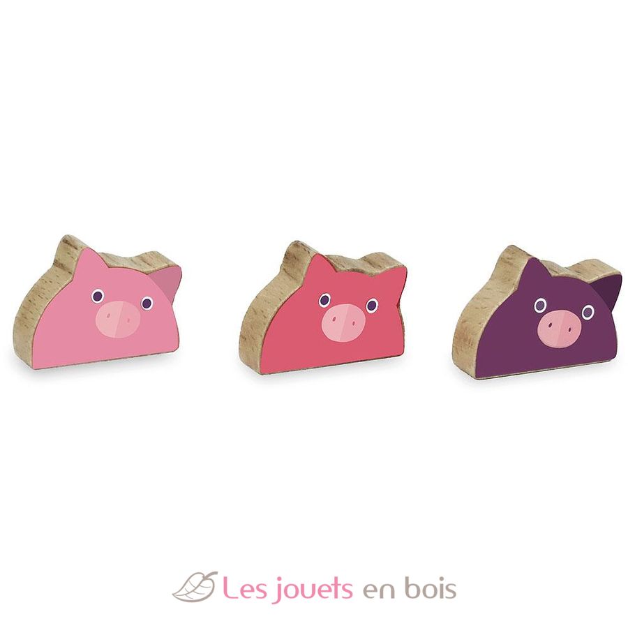 Contient : 1 plateau de jeu en bois, 3 pions cochons en bois, 1 dé, 15 pièces en bois pour la construction des maisons, 1 loup en bois et 2 règles du jeu (l'une en coopération, l'autre chacun pour soi !).